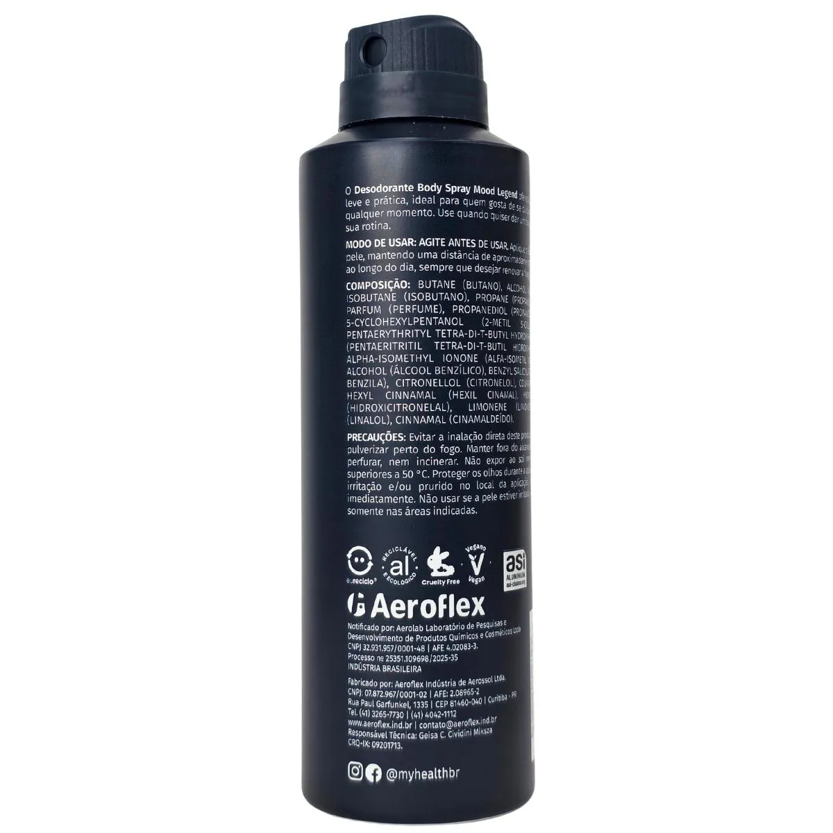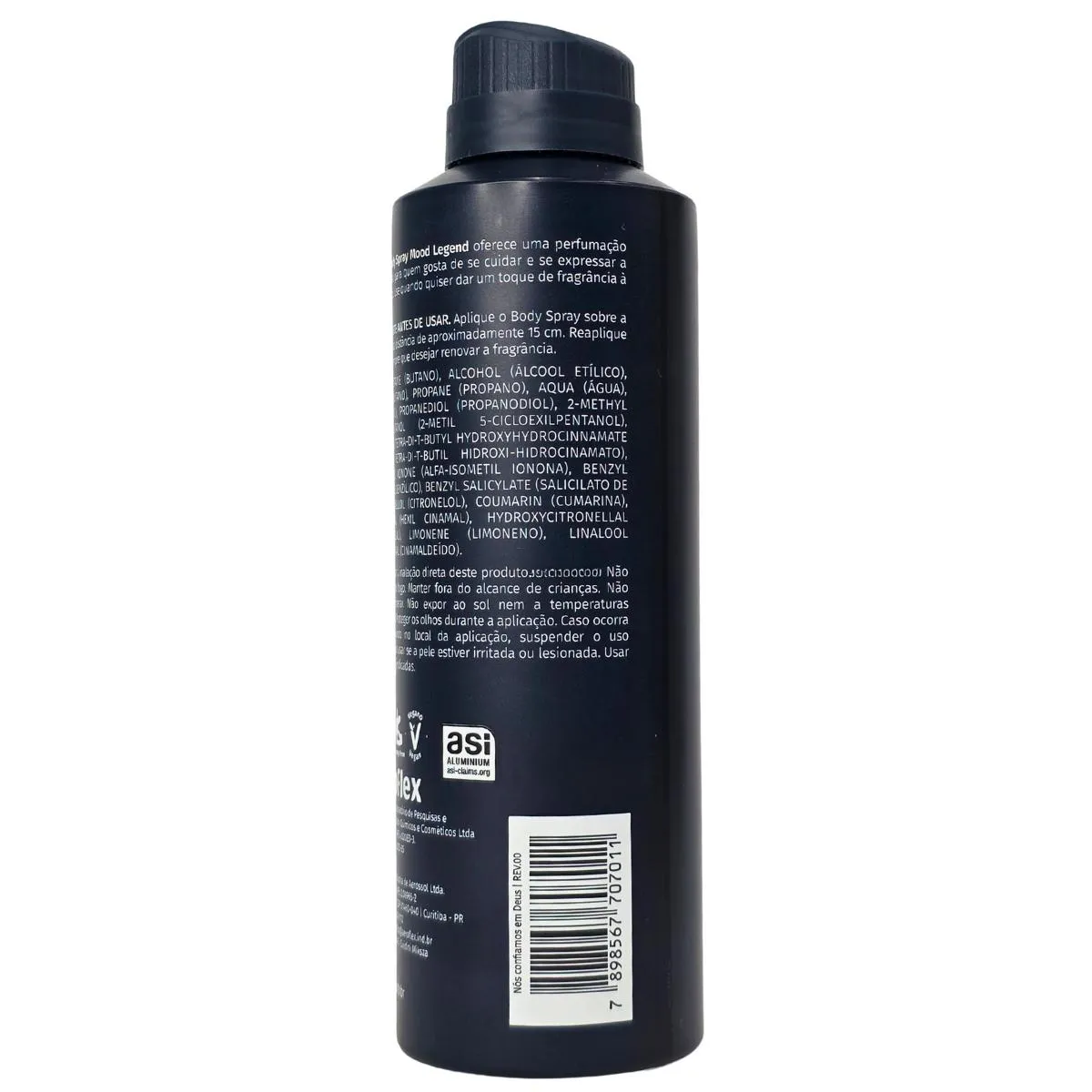 Composição: butane (butano), alcohol (álcool etílico), isobutane (isobutano), propane (propano), aqua (água), parfum (perfume), propanediol (propanodiol), 2-methyl 5-ciclohexilpentanol (2-metil 5-cicloexilpentanol), pentaerythrityl tetra-di-t-butyl hidroxyhydrocinnamate (pentaerIthritIl tetra-di-t-butIl hidroxIhydrocinamato), alpha-isomethyl ionone (alfa-isometil ionona), benzyl salicylate (salicilato de benzila), citronellol (citronelol), coumarin (coumarina), hexyl cinnamal (hexil cinamal), hydroxyitronellal (hidroxicitronelal), limonene (limoneno), linalool (linalol) cinnamal (cinamaldeído).