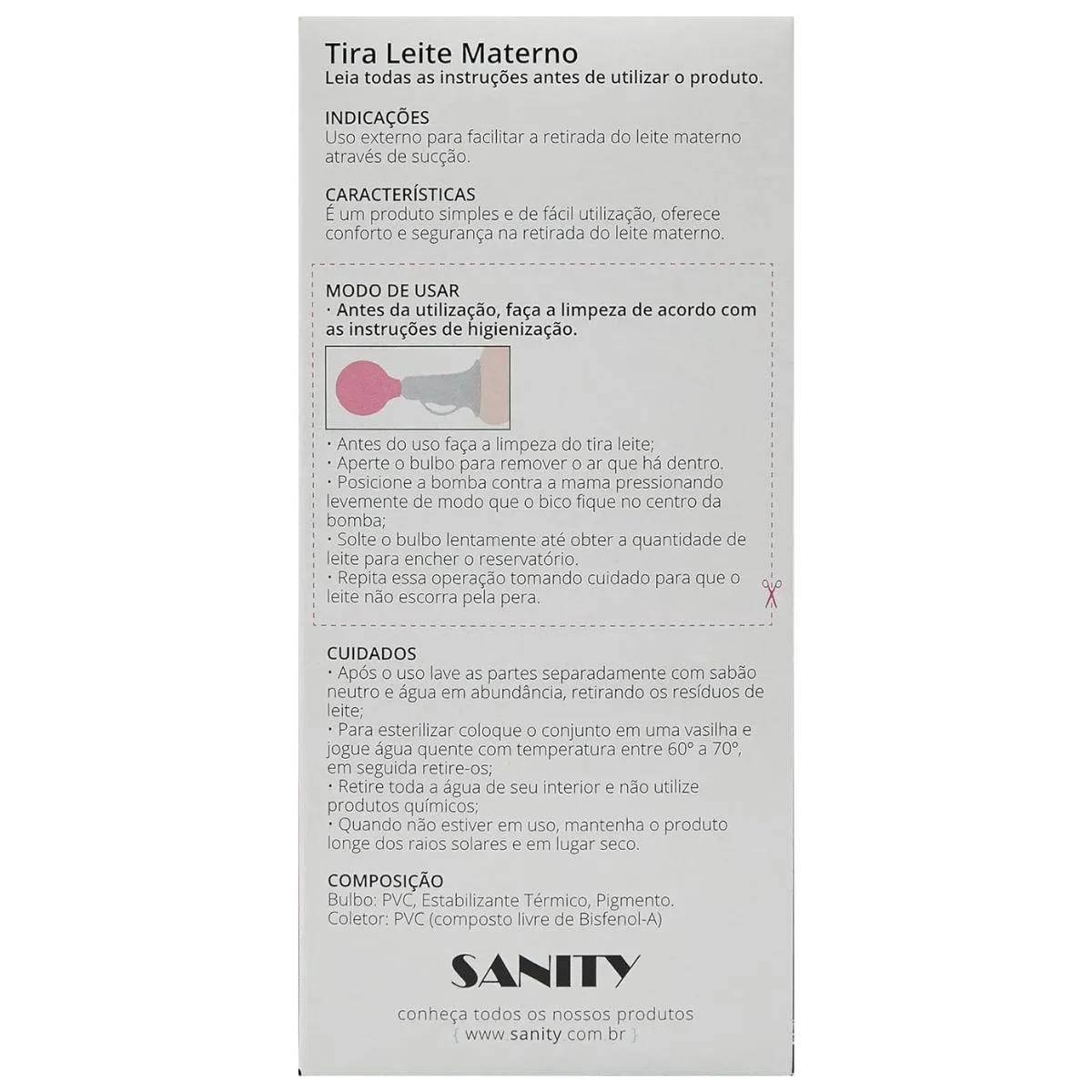 O Tira Leite Sanity é um extrator manual e seguro para as mamães. Ele faz a retirada do leite materno sem causar dor à mulher. Seu material dá estabilidade durante a extração, permitindo uma utilização rápida e confortável. A bomba é indicada para remoção de excesso de leite, ingurgitamento nos seios e outras condições relacionadas à amamentação. Ela também pode ser usada para estimular a produção de leite quando esta não é suficiente. Pequeno e discreto, o produto pode ser levado na bolsa para ser utilizado fora de casa. Permite que a mãe retire o leite excedente em qualquer lugar.