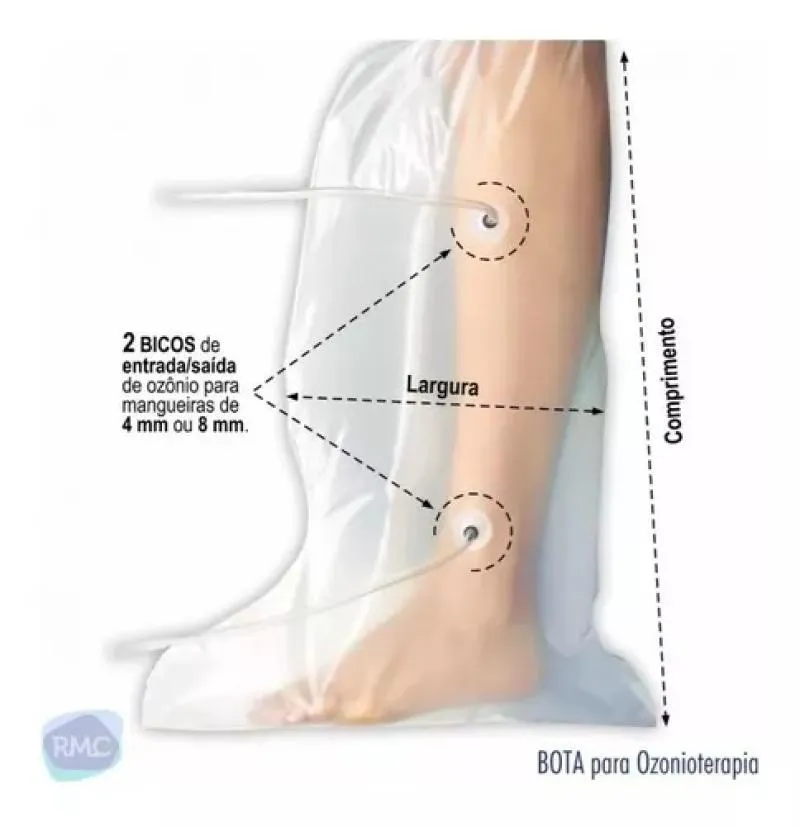 As Botas para Ozonioterapia RMC são indicadas para o uso em procedimentos de ozonioterapia em qualquer equipamento gerador de ozônio, que necessite de aplicadores dessa modalidade. Com registro na ANVISA, são fabricados em material resistente e confortável. Contém bicos de entrada/saída de ozônio que são de fácil conexão as mangueiras do equipamento.