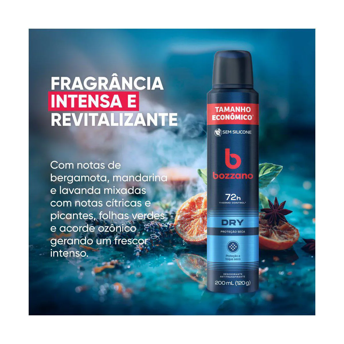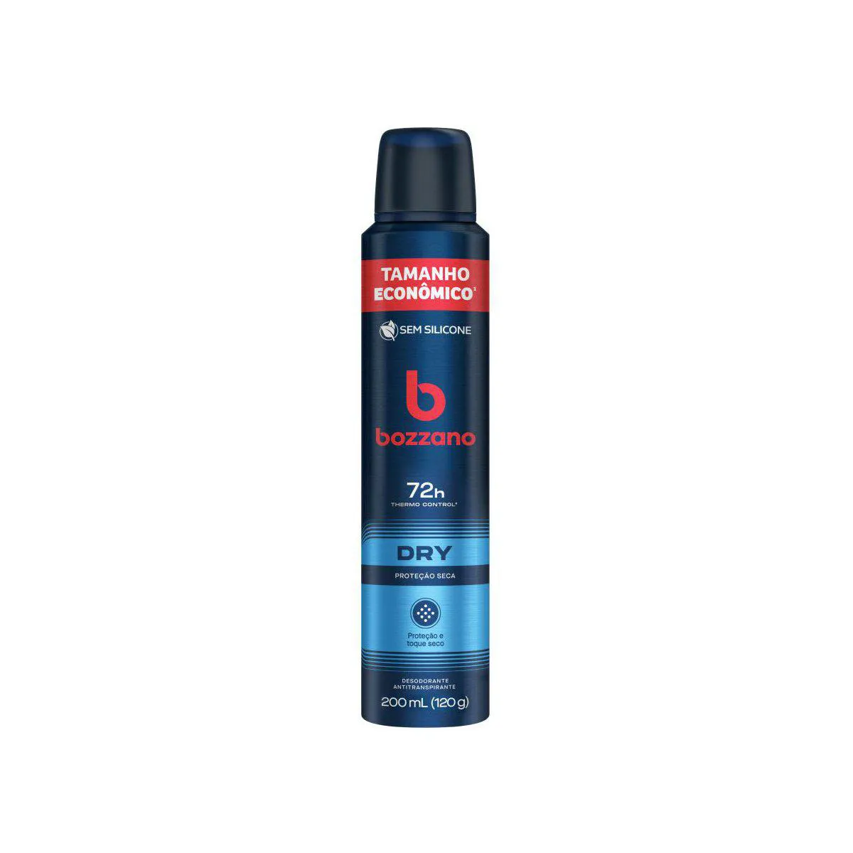 Bozzano Dry é um desodorante antitranspirante em formato aerossol que ajuda a controlar o suor e o mau odor, oferecendo proteção por até 72 horas e com toque seco na pele para manter você sempre protegido durante o dia. Sua fórmula conta com tecnologia Thermo Control que mantém proteção mesmo com a variação de temperatura.