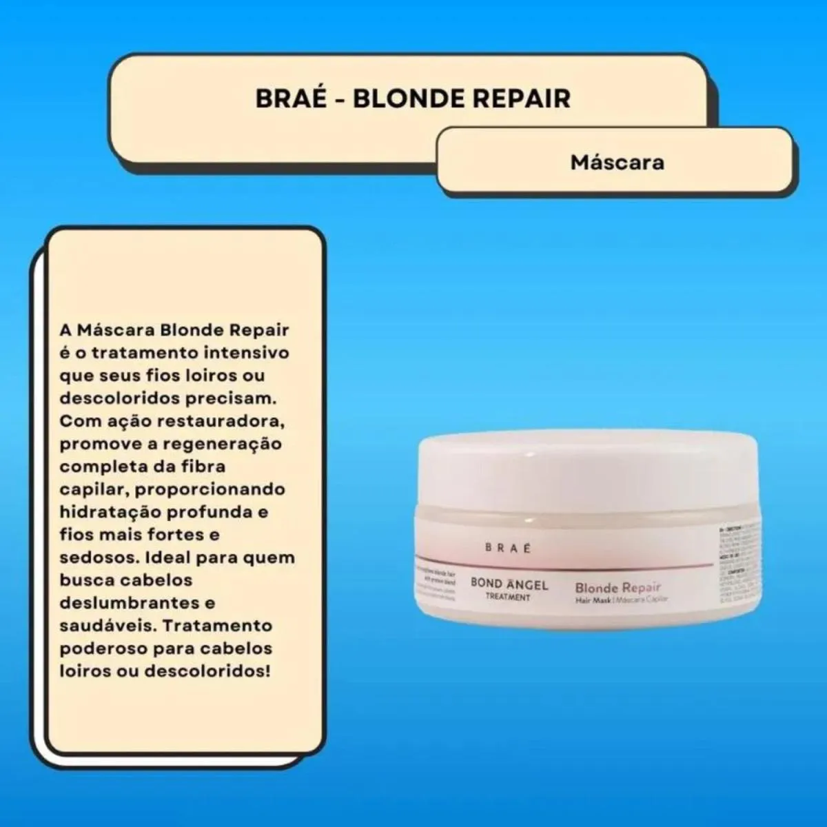 Braé Bond Angel Máscara 200g é uma máscara reconstrutora intensa desenvolvida para restaurar os fios danificados por processos químicos, como descoloração, alisamento e coloração. Sua fórmula exclusiva repara as ligações internas da fibra capilar, devolvendo força, resistência e brilho, enquanto proporciona maciez e maleabilidade.
