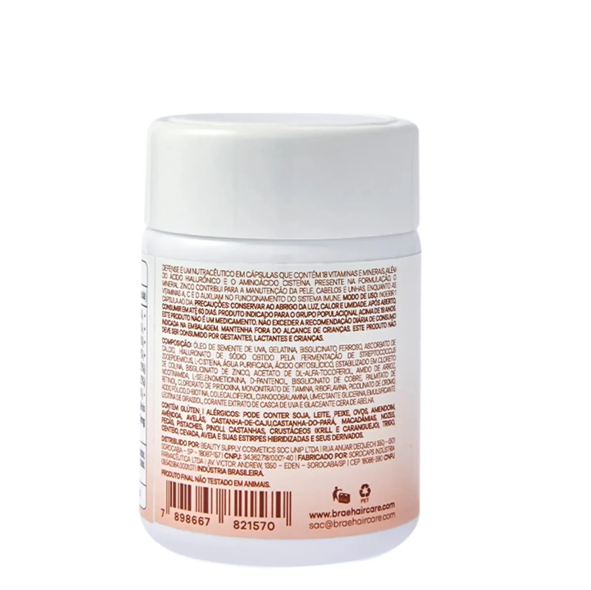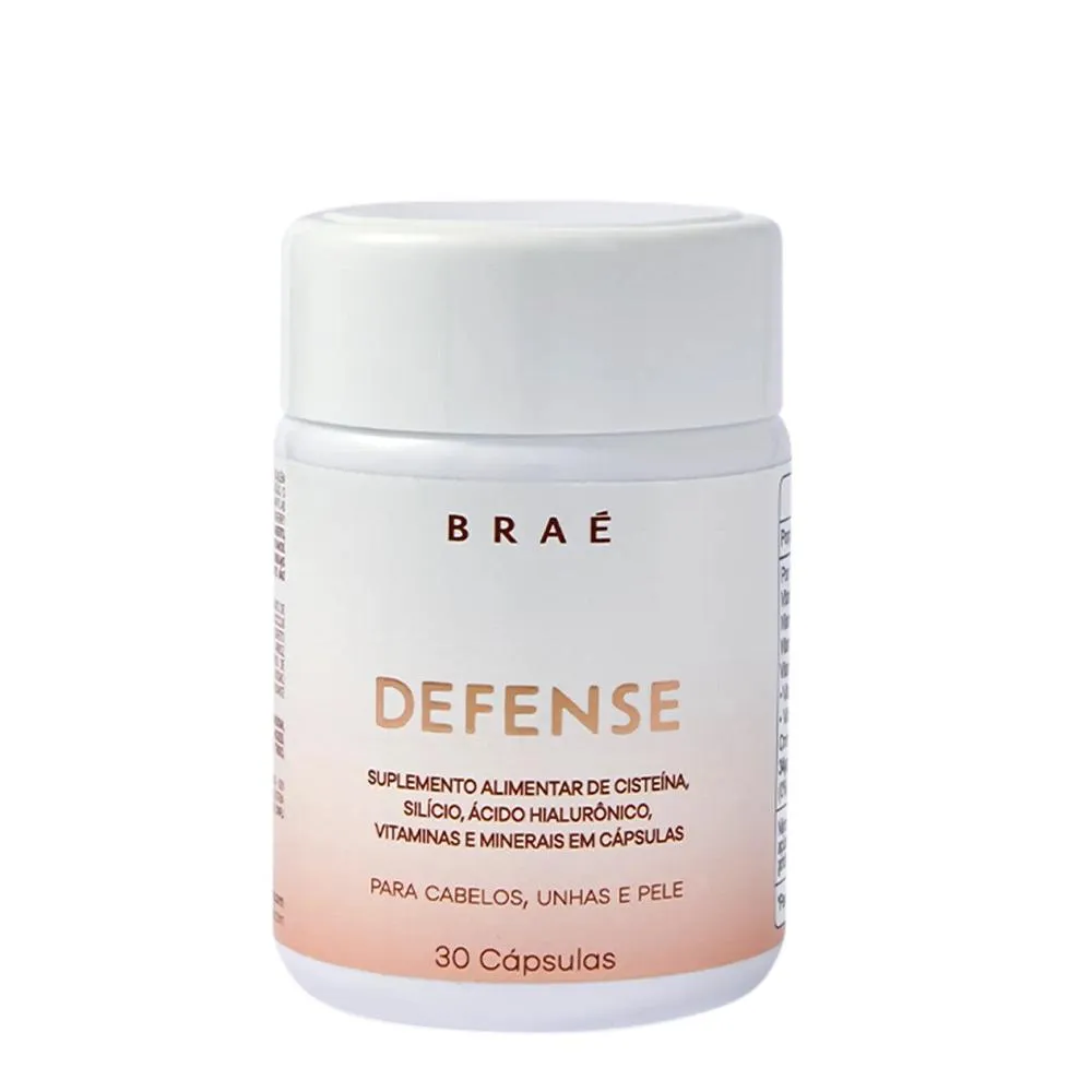 O Suplemento Alimentar Braé Defense é um nutracêutico em cápsulas que contém 18 vitaminas e minerais, além do ácido hialurônico e aminoácido cisteína. Proporciona reposição e equilíbrio dos nutrientes que interferem diretamente na formação de tecidos e na saúde capilar. Ideal para a manutenção e vitalidade do cabelo, pele e unhas.