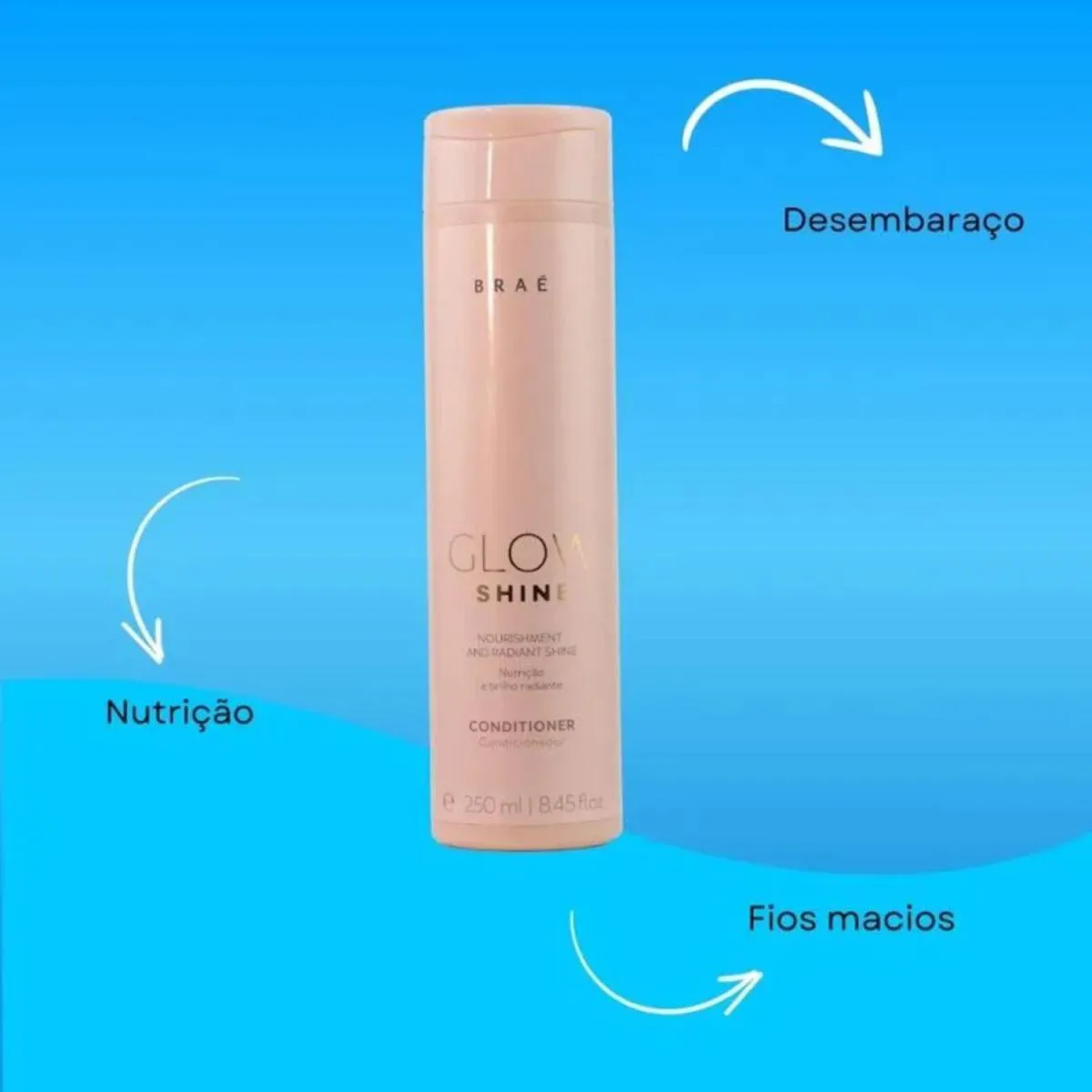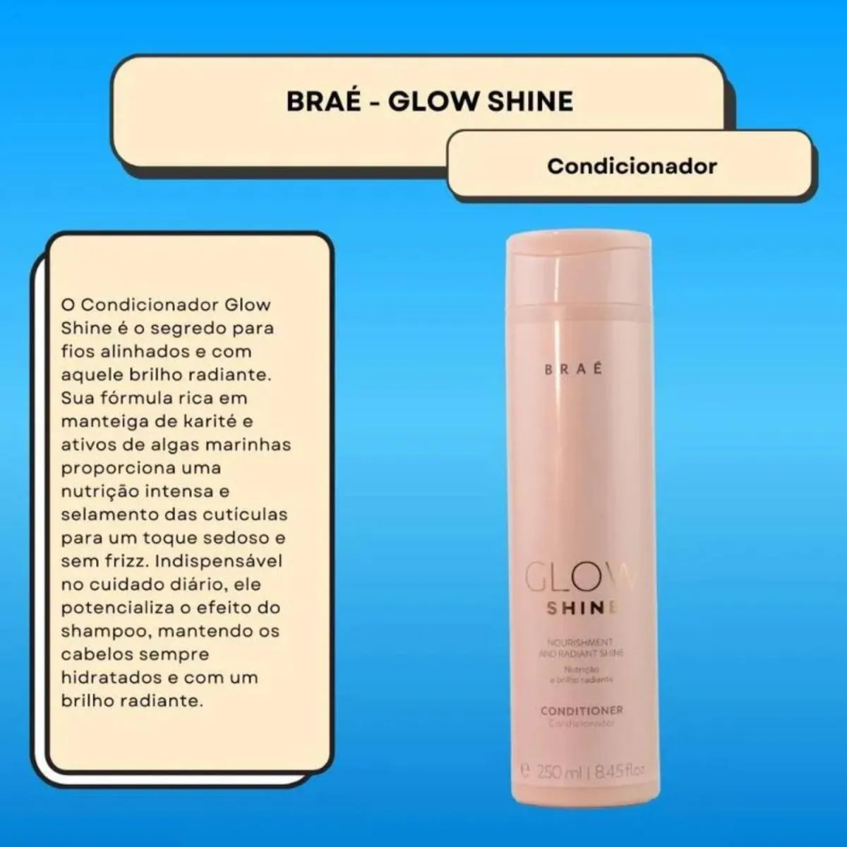 Braé Glow Shine condicionador 250ml é um tratamento nutritivo e iluminador desenvolvido para revitalizar e realçar o brilho dos cabelos opacos e sem vida. Sua fórmula leve e sofisticada hidrata profundamente, garantindo fios soltos, sedosos e com um brilho radiante desde a primeira aplicação.