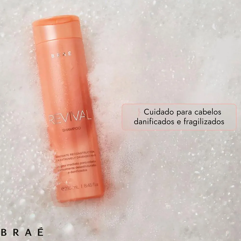 Aplique o Shampoo Braé Revival nos cabelos molhados, massageando suavemente o couro cabeludo até formar espuma. Enxágue bem e, se necessário, repita a aplicação. Para melhores resultados, siga com a Máscara de Reconstrução Braé Revival e o condicionador Revival.