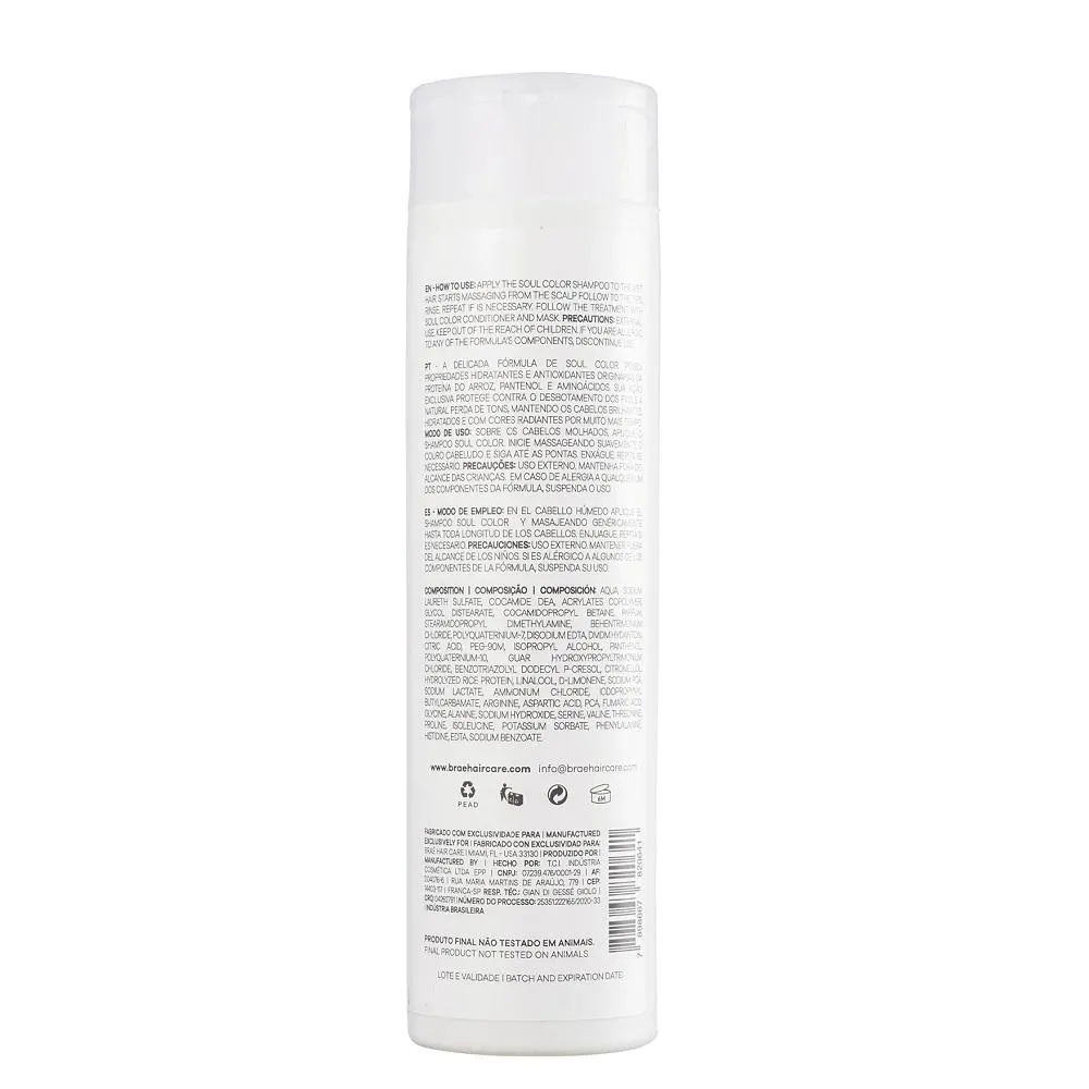 BRAÉ Soul Color - shampoo 250ml: Higieniza os fios de maneira suave, sua ação antioxidante e nutritiva protege e renova os fios evitando o desbotamento da cor e os danos à fibra capilar.