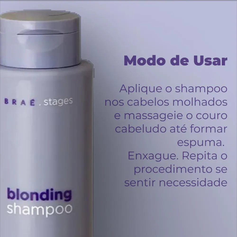 Matizar e tratar os cabelos loiros e/ou descoloridosNeutralizar os tons amarelados e alaranjados dos fios loiros e/ou descoloridosBraé Stages Blonding Shampoo combina em sua fórmula