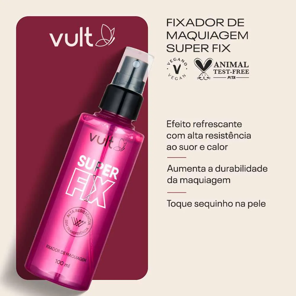 O Fixador de Maquiagem Vult Super Fix é um spray finalizador que tem como finalidade aumentar a durabilidade da maquiagem, garantindo que ela se mantenha intacta por horas, mesmo sob condições de calor e suor.