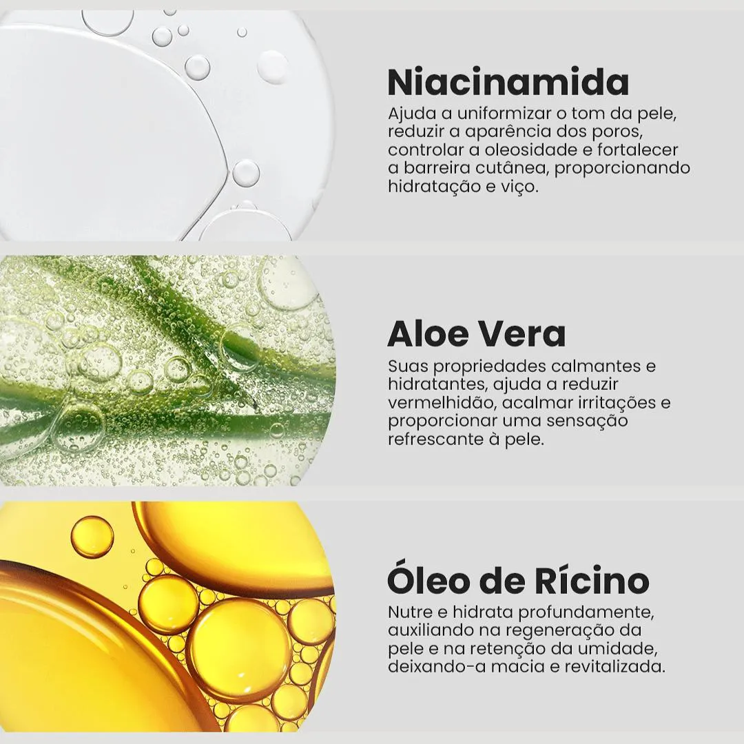 - Hidrata e acalma com Niacinamida e Aloe Vera