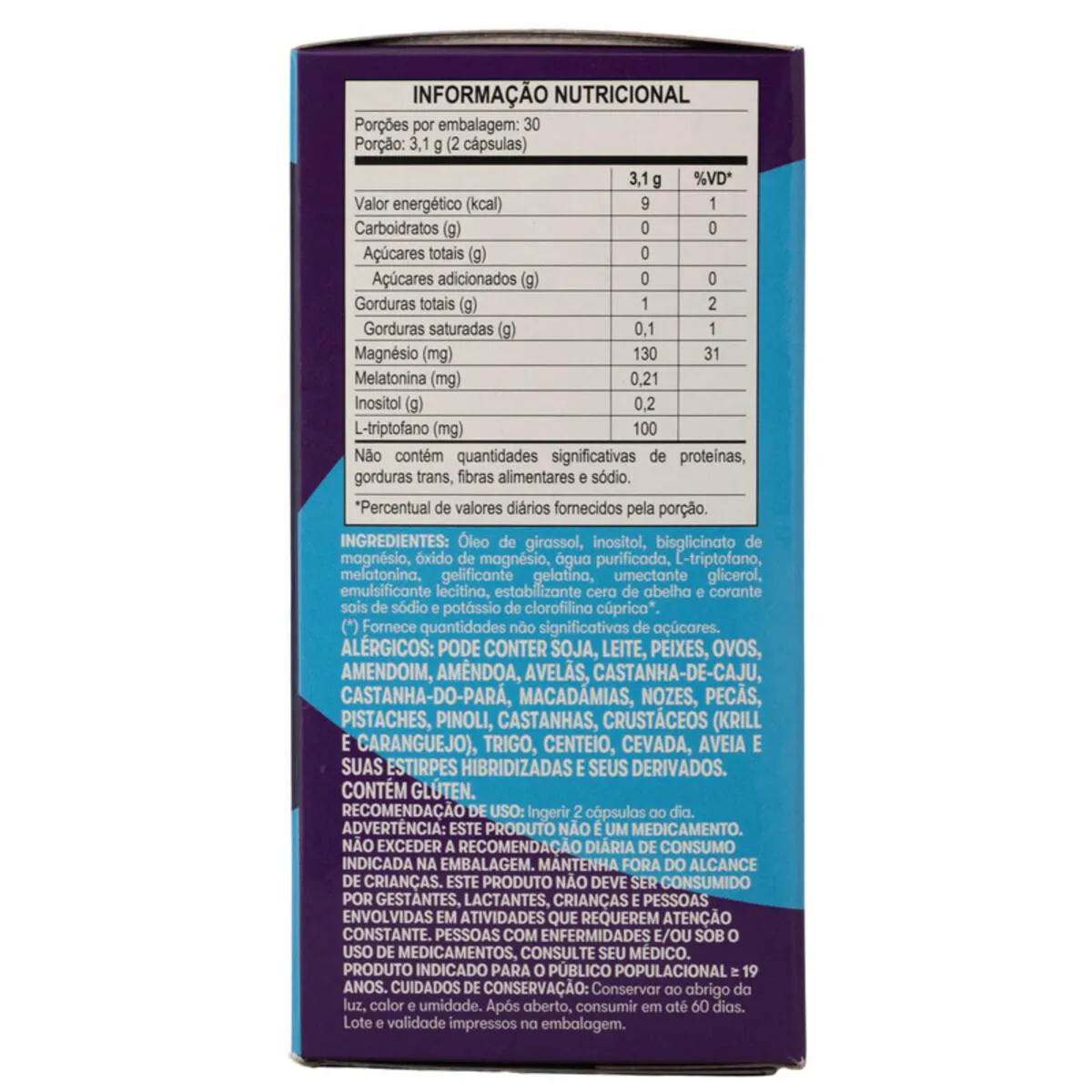 Óleo de girassol, inositol, bisglicinato de magnésio, óxido de magnésio, água purificada, L-triptofano, melatonina, gelificante gelatina, umectante glicerol, emulsificante lecitina, estabilizante cera de abelha e corante sais de sódio e potássio de clorofilina cúprica.