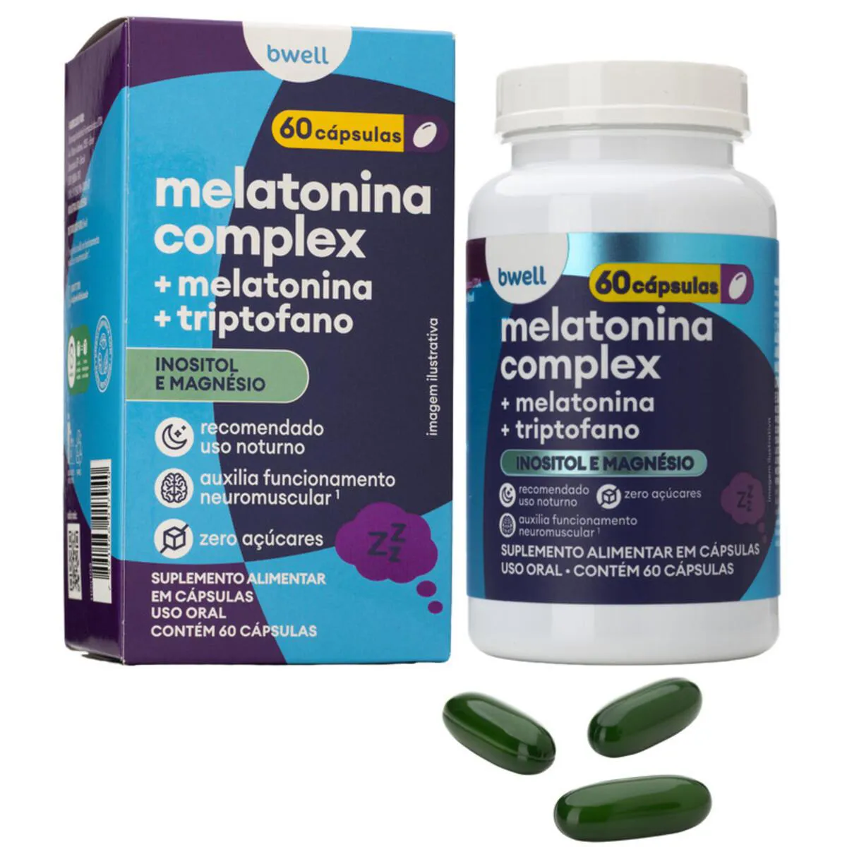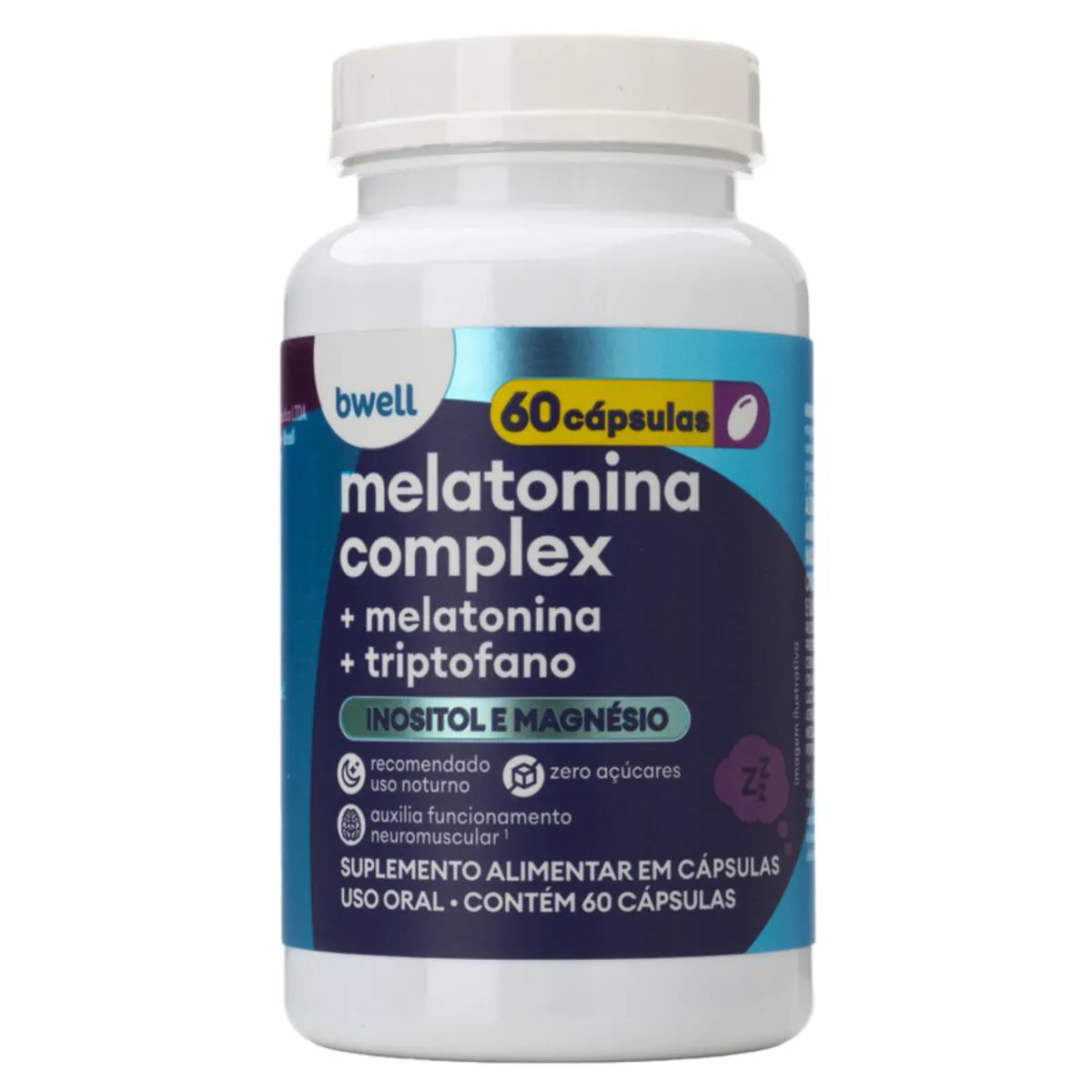 A Melatonina Bwell Complex é um suplemento alimentar em cápsulas gelatinosas, formulado com melatonina, L-triptofano, inositol e magnésio. Indicado para adultos a partir de 19 anos, auxilia no funcionamento neuromuscular, no metabolismo energético e na regulação do sono. É ideal para quem busca mais qualidade de vida e bem-estar, especialmente durante a noite.