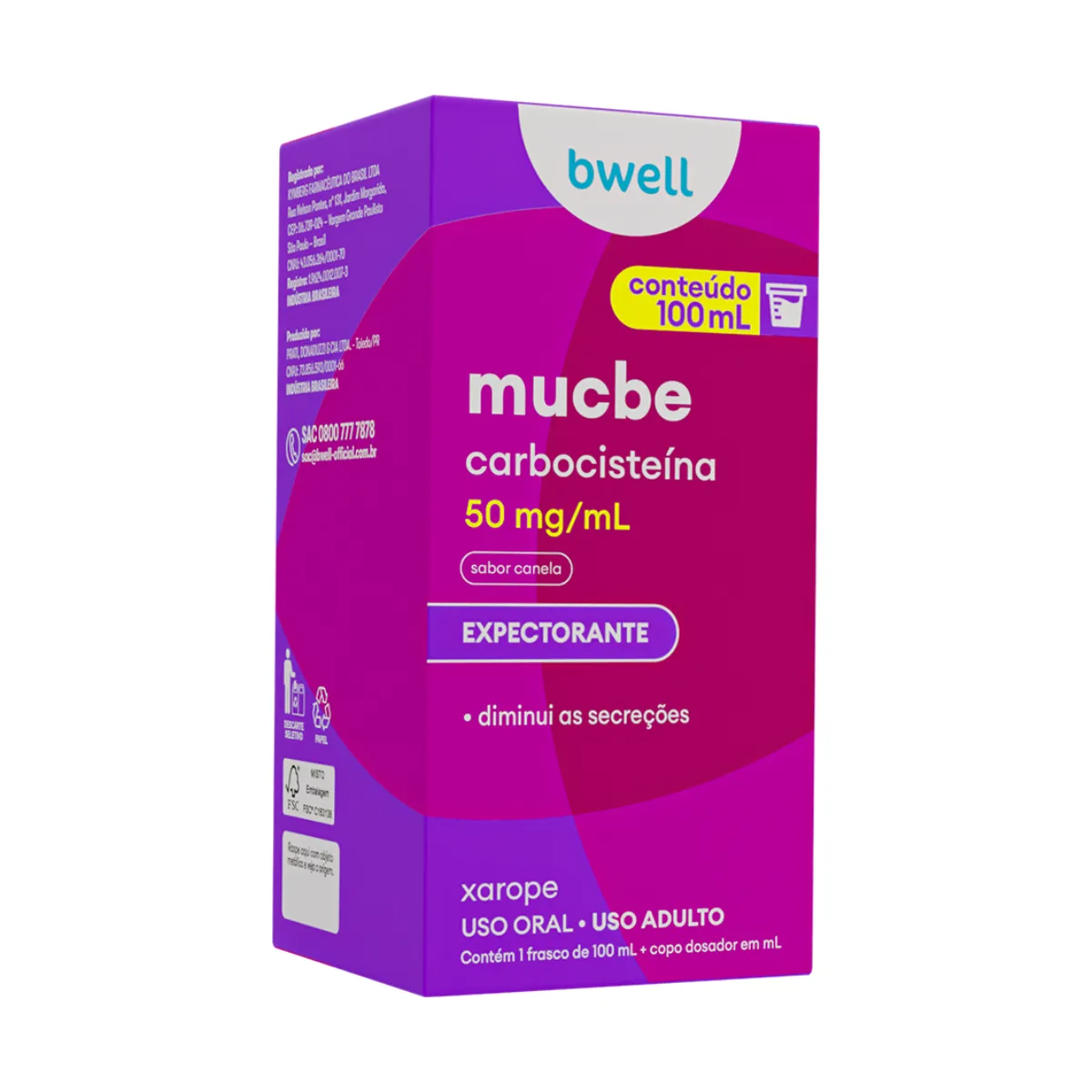 O Bwell Mucbe 50mg é um xarope à base de carbocisteína, indicado para o tratamento de problemas respiratórios que envolvem excesso de secreções. Ele atua diminuindo a produção e a viscosidade do muco, facilitando sua eliminação e melhorando a respiração do paciente.