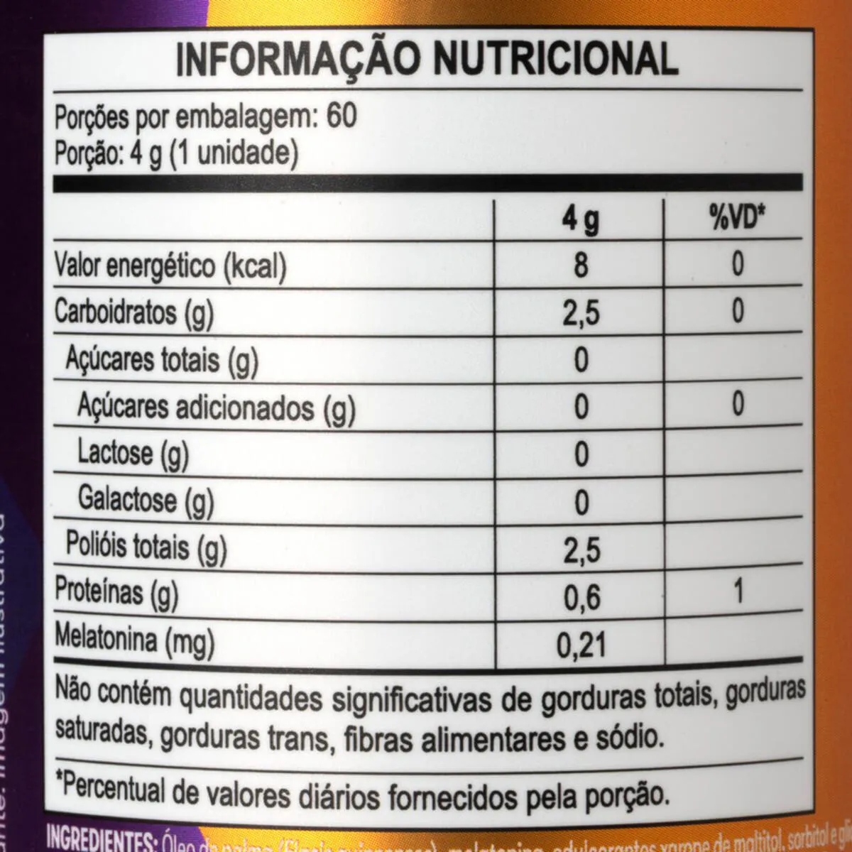 Óleo de palma (Elaeis guineenses), melatonina, edulcorantes xarope de maltitol, sorbitol e glicosídeos de esteviol de Stevia rebaudiana Bertoni, gelificantes gelatina e pectinas, acidulantes ácido cítrico e ácido lático, aromatizante natural de laranja, corante beta-caroteno sintético, conservante sorbato de potássio, glaceante cera de carnaúba.