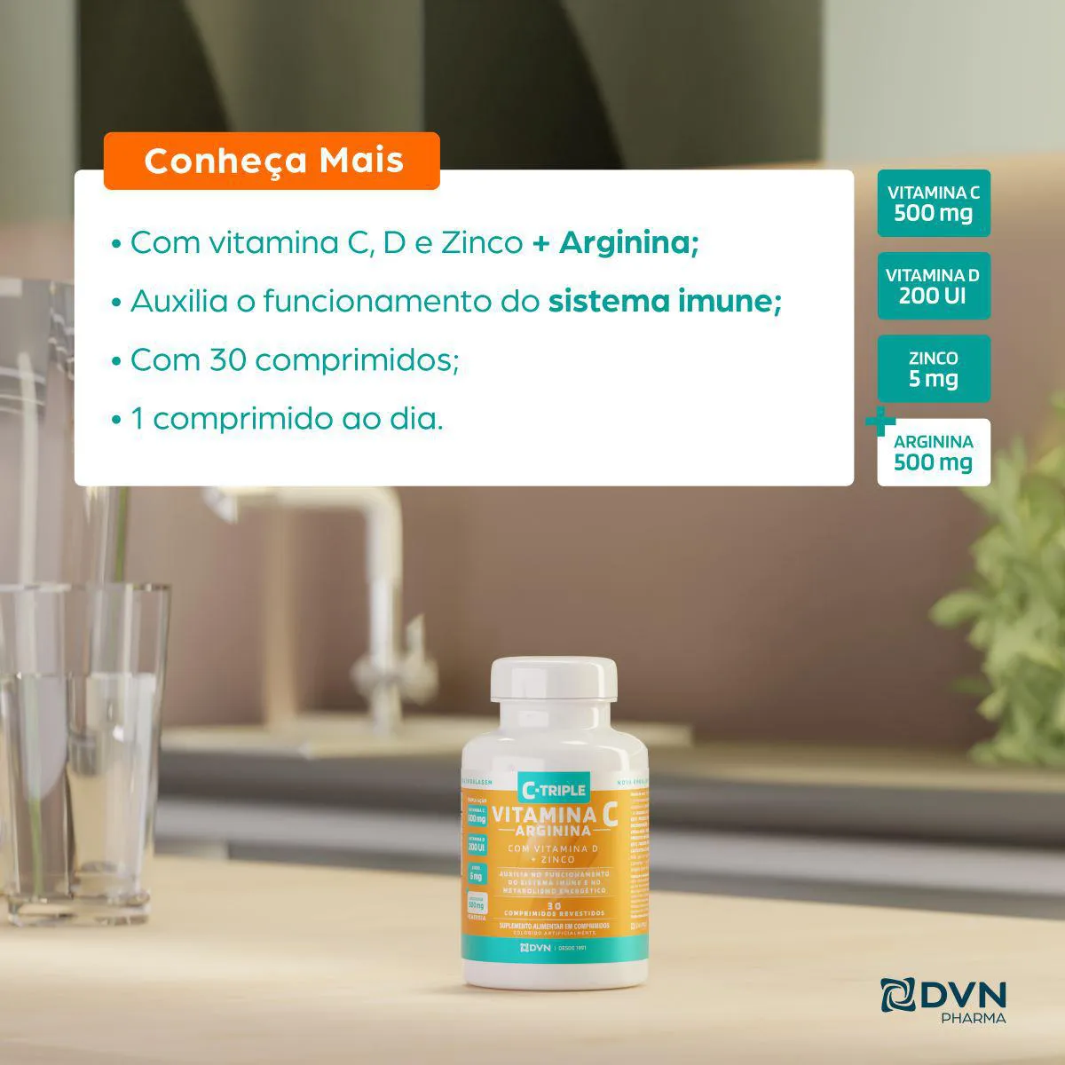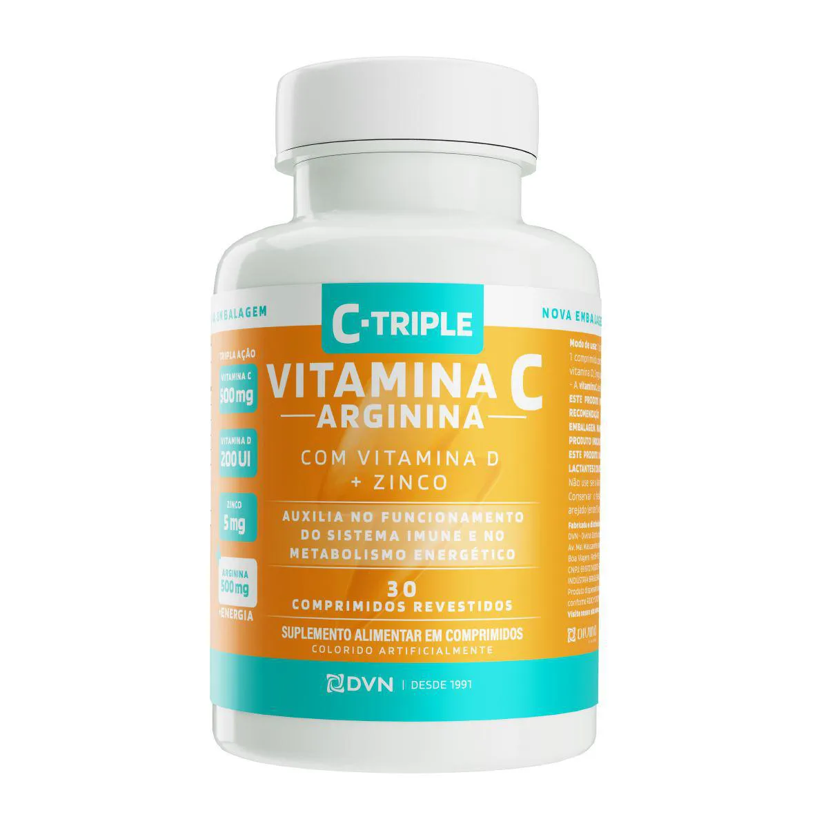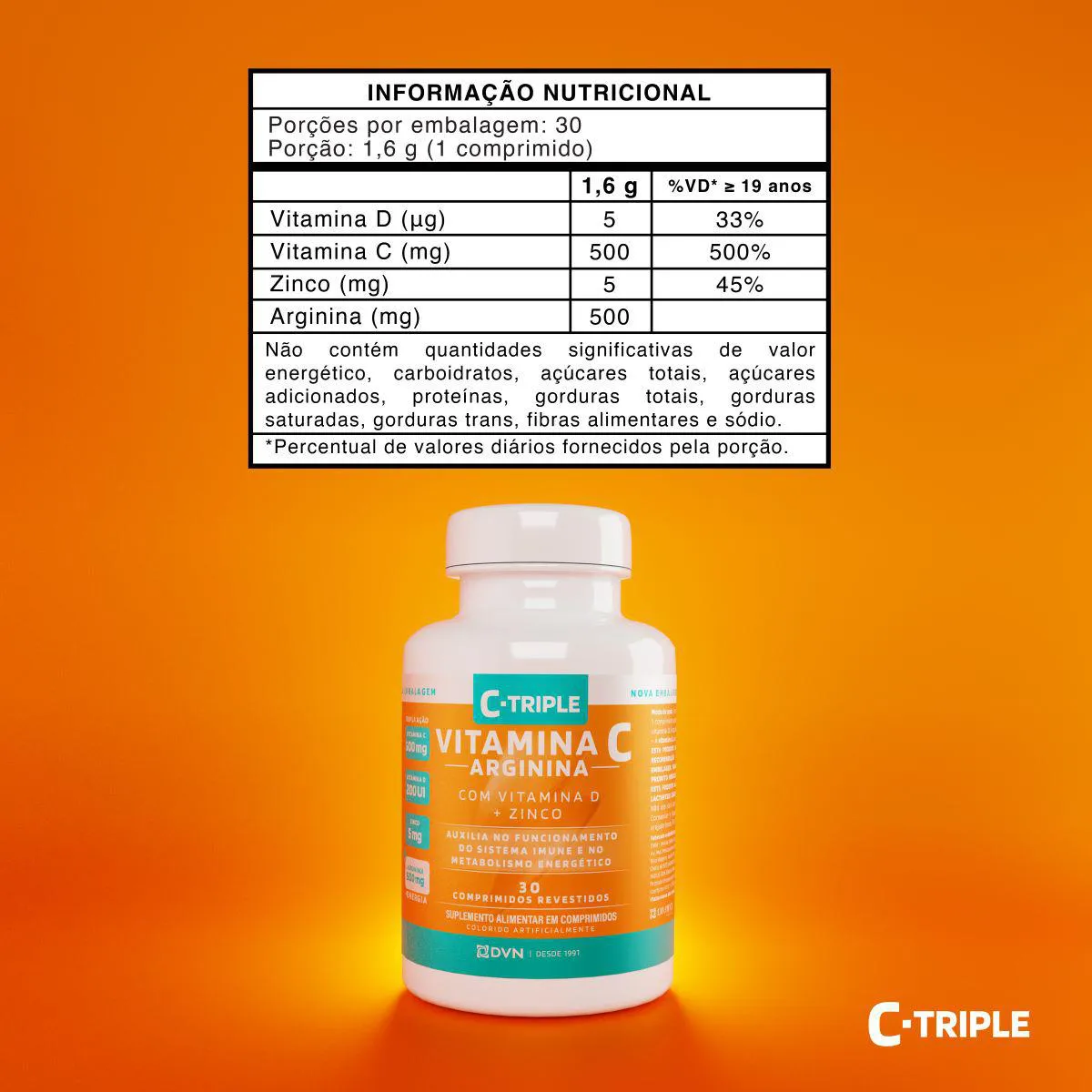 O Vitamina C C-Triple + Arginina é um suplemento alimentar em comprimidos, composto por Vitamina C 500mg, Arginina 500mg, vitamina d 400UI e Zinco 5mg, desenvolvido para adultos como complemento nutricional.