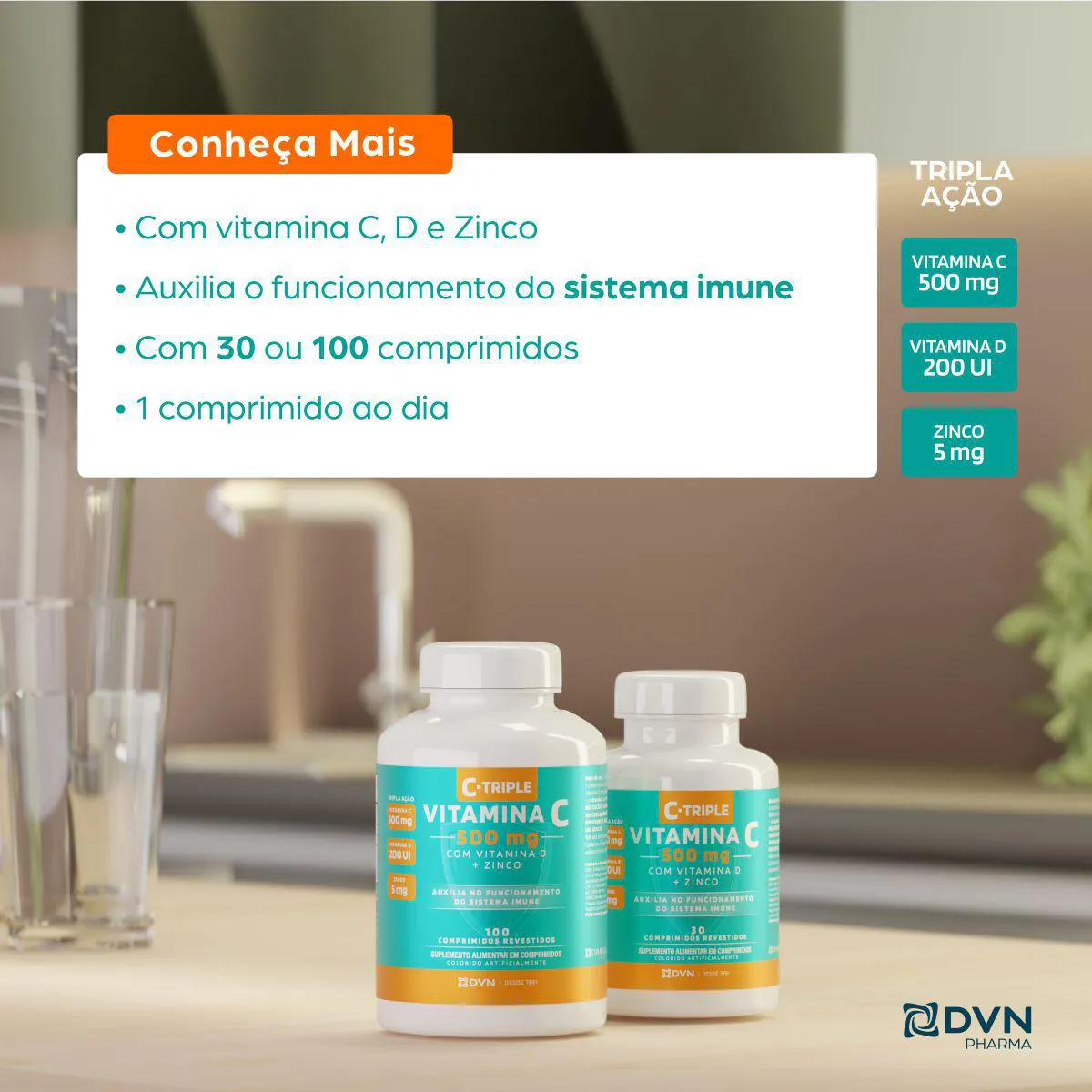 - Combinação eficaz de vitamina C, D e zinco em um único comprimido.