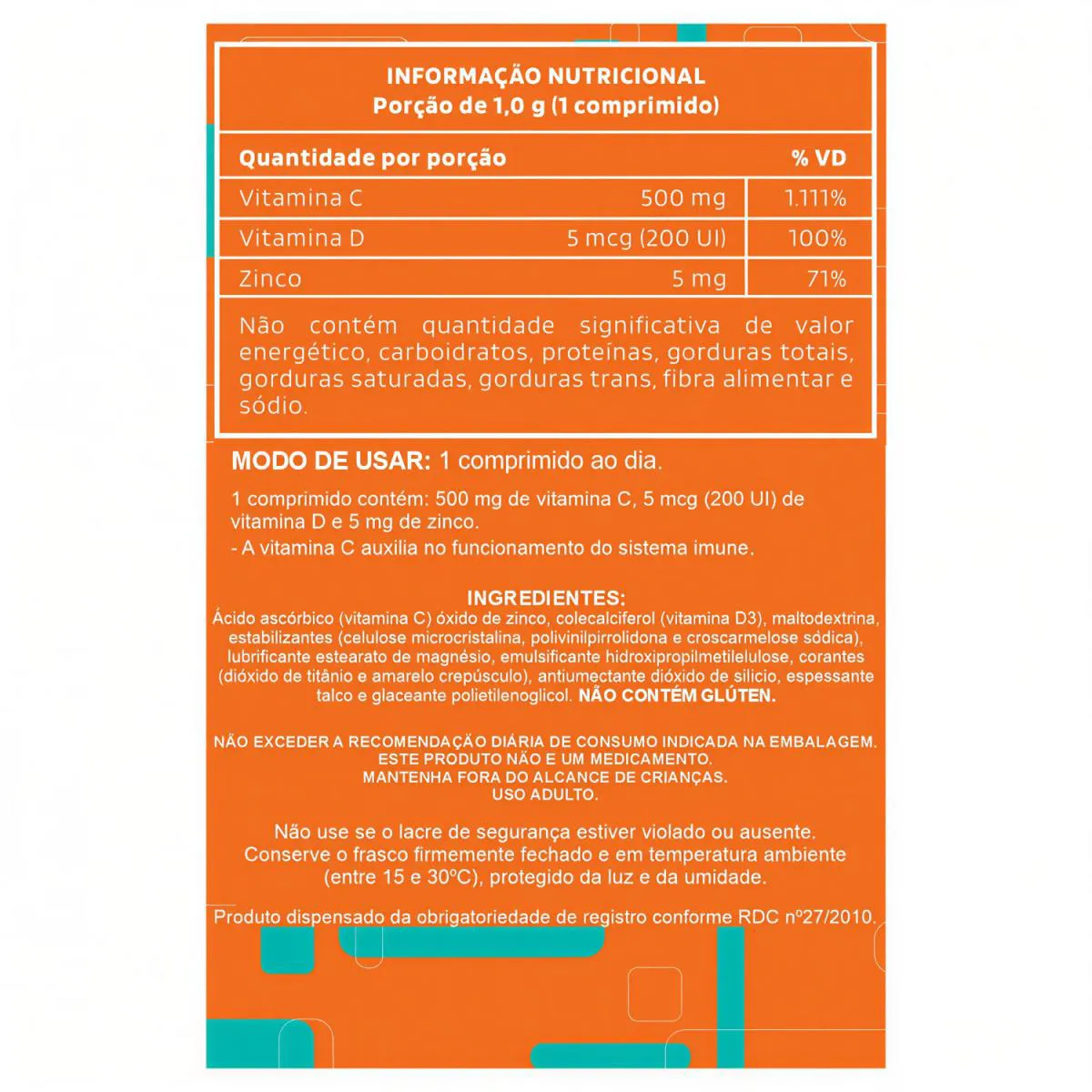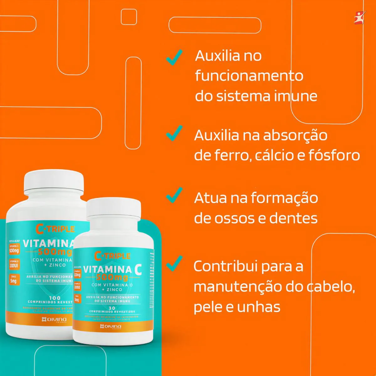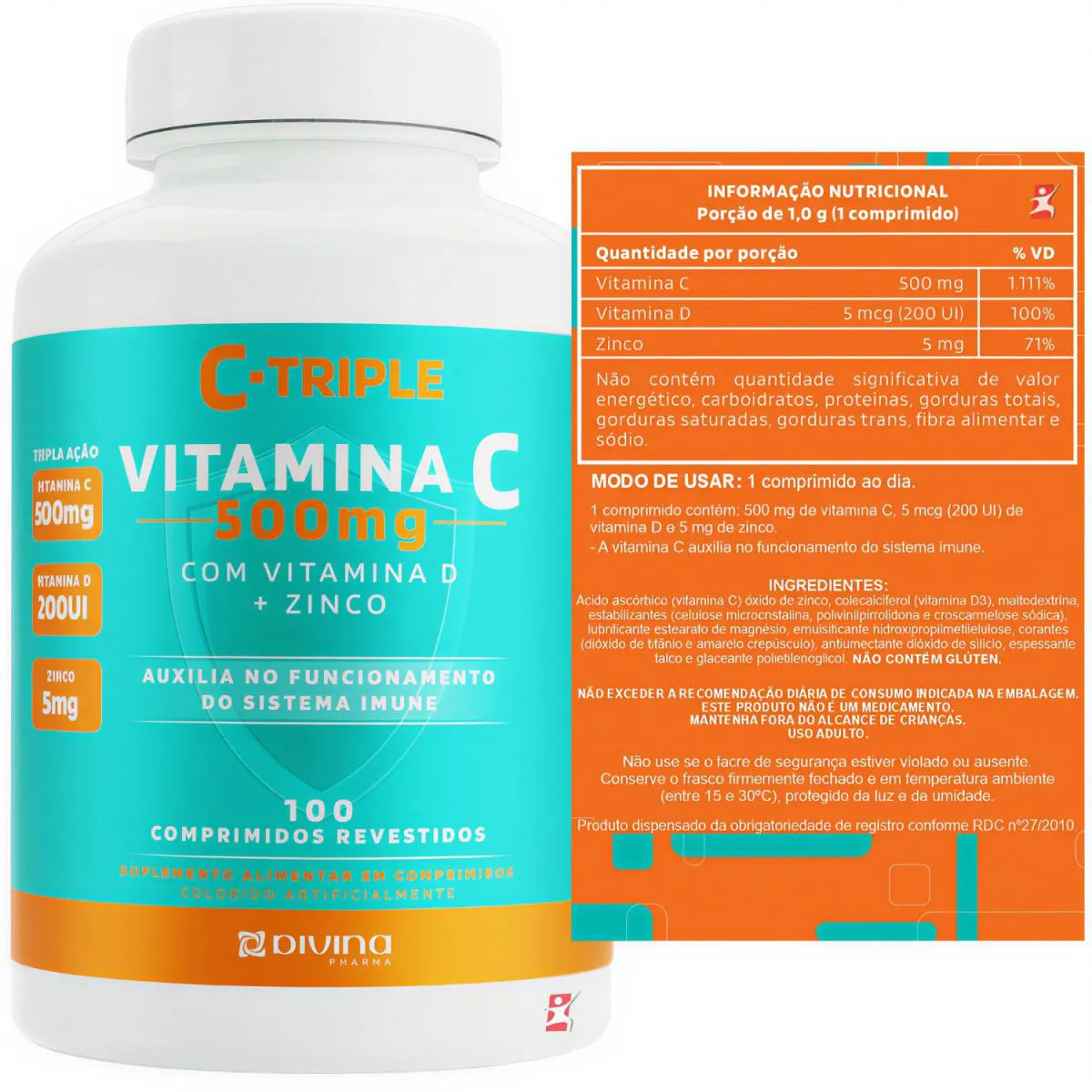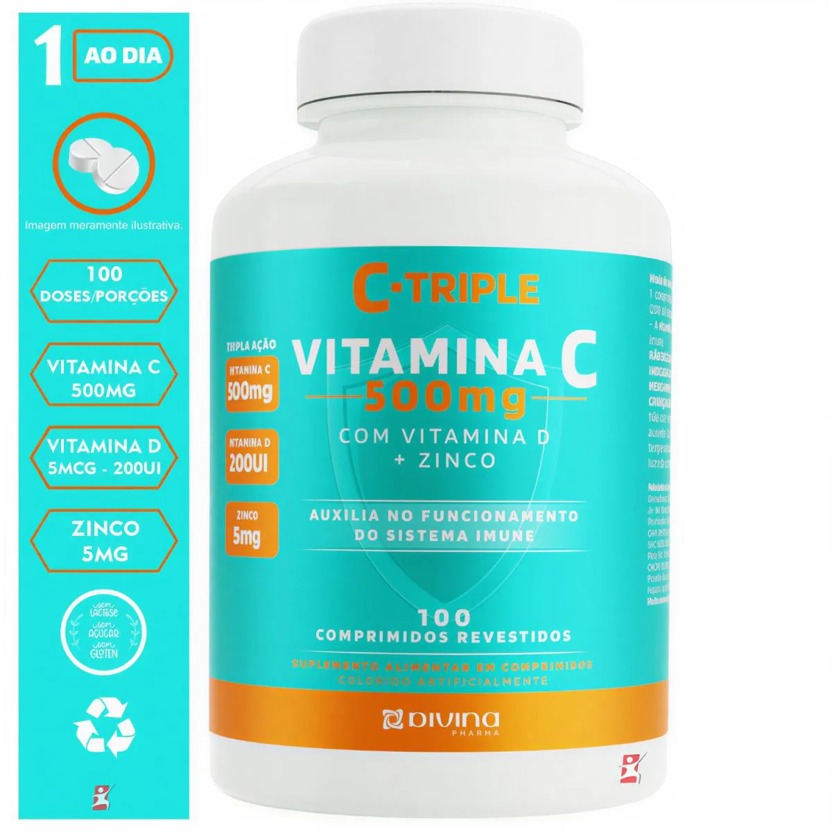C-TRIPLE vitamina c 500MG + ZINCO + vitamina d 100 COMPRIMIDOS - DIVINA PHARMA DESCRIÇÃO Vitamina C da linha C-Triple Divina Pharma é um suplemento composto por Vitamina C (ácido ascórbico), Vitamina D3 (colecalciferol) e Zinco. A combinação dessas vitaminas e minerais auxiliam na saúde imunológica, auxilia na formação do colágeno, na absorção de ferro dos alimentos e na proteção de danos causados por radicais livres. BENEFÍCIOS - Apenas 1 comprimido ao dia; - Cada frasco fornece 100 doses/porções; - Auxilia no funcionamento do sistema imune; - Propriedade antioxidante; - Contribui para a manutenção do cabelo, pele e unhas; - Auxilia na absorção de ferro, cálcio e fósforo; - Auxilia na formação de ossos e dentes; - Não contém: lactose e glúten; - Sem sabor; - Comprimidos revestidos. SUGESTÃO DE USO Consumir 1 comprimido ao dia. TABELA NUTRICIONAL - COMPOSIÇÃO & RECOMENDAÇÕES Anexo nas imagens. DADOS TÉCNICOS Registro ANVISA – Produto dispensado de obrigatoriedade de registro conforme RDC 27/2010. MARCA – Divina Pharma. Conteúdo líquido total – 100 comprimidos. Rendimento líquido total – 100 doses/porções. Peso líquido total – 100g. Peso bruto total – 145g. Peso produto + embalagem (aproximado) – 250g. Código de barras (EAN) – 7898966313127. Dimensões do produto – largura: 7cm; altura: 14,5cm; comprimento: 4,5cm. Dimensões da embalagem de envio – largura: 13cm; altura: 10cm; Comprimento: 16cm. ITENS DO ANÚNCIO 1 unidade do produto: C-TRIPLE VITAMINA C 500MG + ZINCO + VITAMINA D 100 COMPRIMIDOS - DIVINA PHARMA. Total: 100 comprimidos CADA FRASCO.
