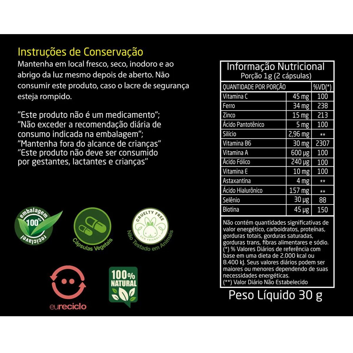 "Este produto não é um medicamento";"Não exceder a recomendação diária de consumo indicada na embalagem";"Mantenha fora do alcance de crianças"“Este produto não deve ser consumido por gestantes, lactantes e crianças” Instruções de Conservação