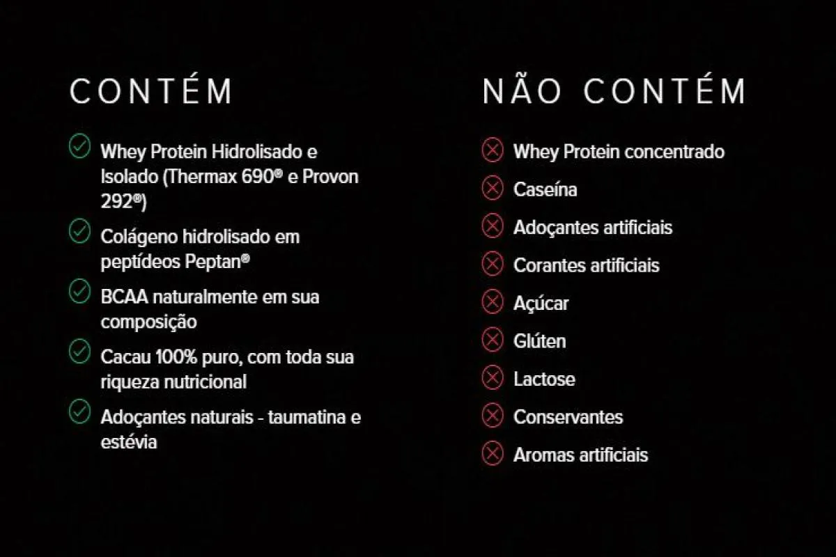 Cacao Whey é um delicioso blend de Whey Protein Hidrolisado e Isolado, Cacau Gourmet e colágeno hidrolisado em peptídeos, que agregam valor à fórmula e complementam a ação do produto.Cada dose de Cacao Whey fornece 44% das necessidades diárias de proteína recomendadas para um adulto. Essas proteínas são obtidas através do CFM (Cross-flow Microfiltration), um processo de extração limpo e purificado, que não utiliza produtos químicos para isolar a proteína de componentes indesejáveis, como caseína, gordura, carboidratos e lactose. INFORMAÇÃO NUTRICIONAL Coloque uma atenção especial na lista de ingredientes: o ingrediente que estiver em maior quantidade vem primeiro, e assim por diante. Você vai perceber que todos os produtos da linha Essential são livres de calorias vazias e cheios de ingredientes naturais. Tudo que adicionamos contribui para uma nutrição mais completa.