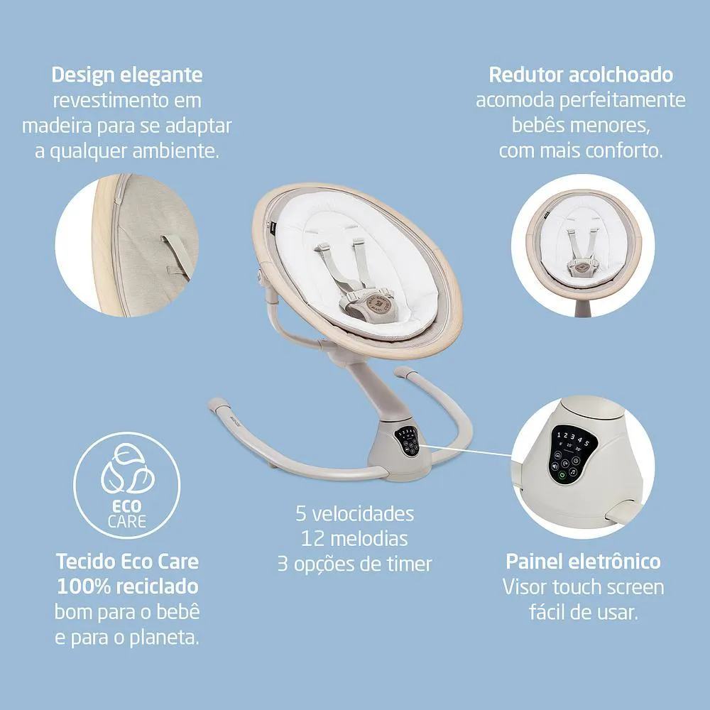 •Visor Touchscreen: Fácil de usar, permite controlar as funções da cadeira, como o balanço, a escolha entre 15 melodias relaxantes e o temporizador com 3 opções de tempo.