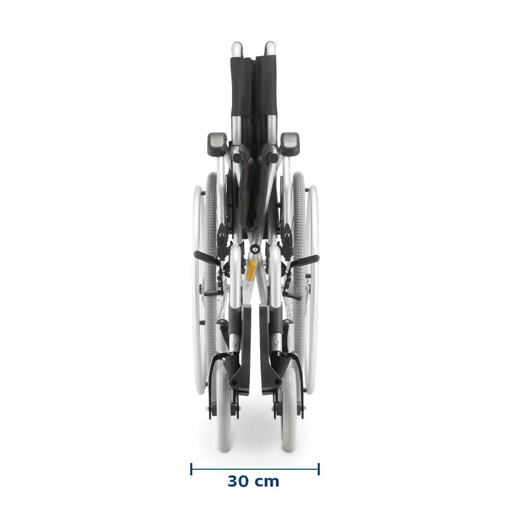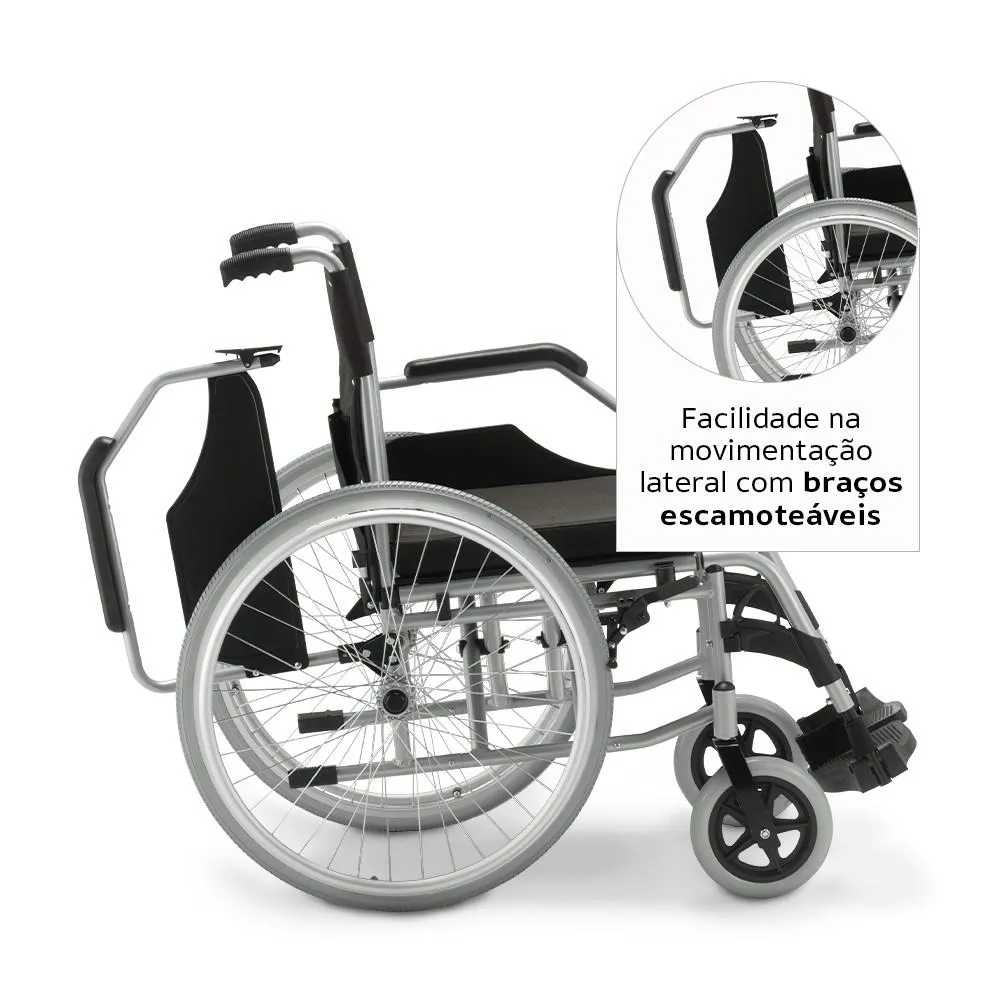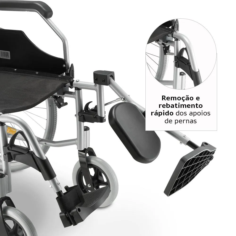 Possui braços e pernas escamoteáveis, pedal com ajustes de altura, encosto fixo e quick release nas rodas traseiras.