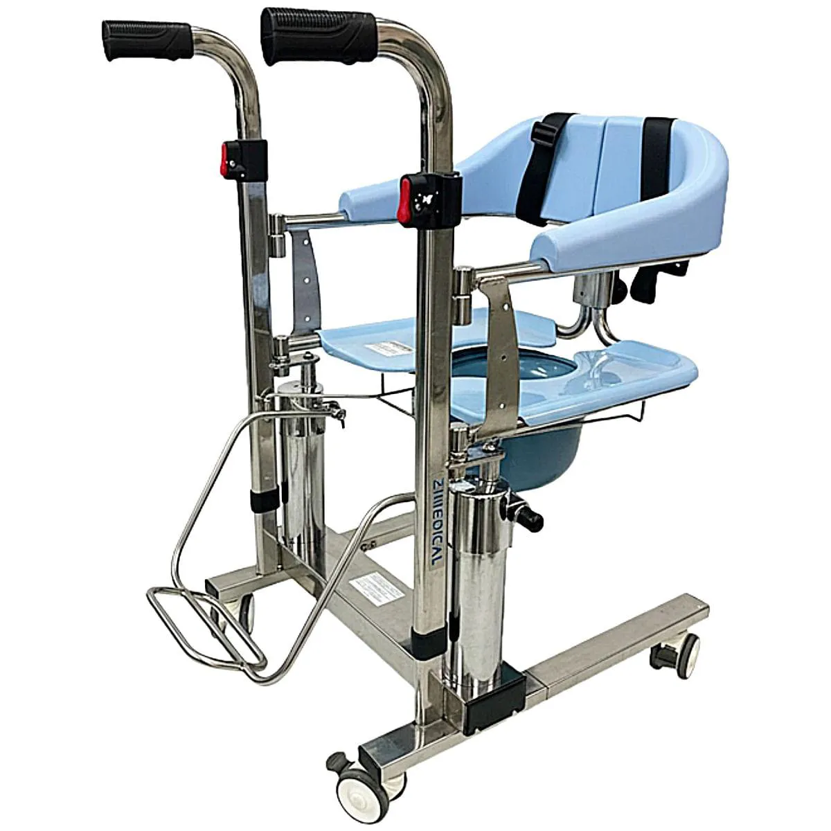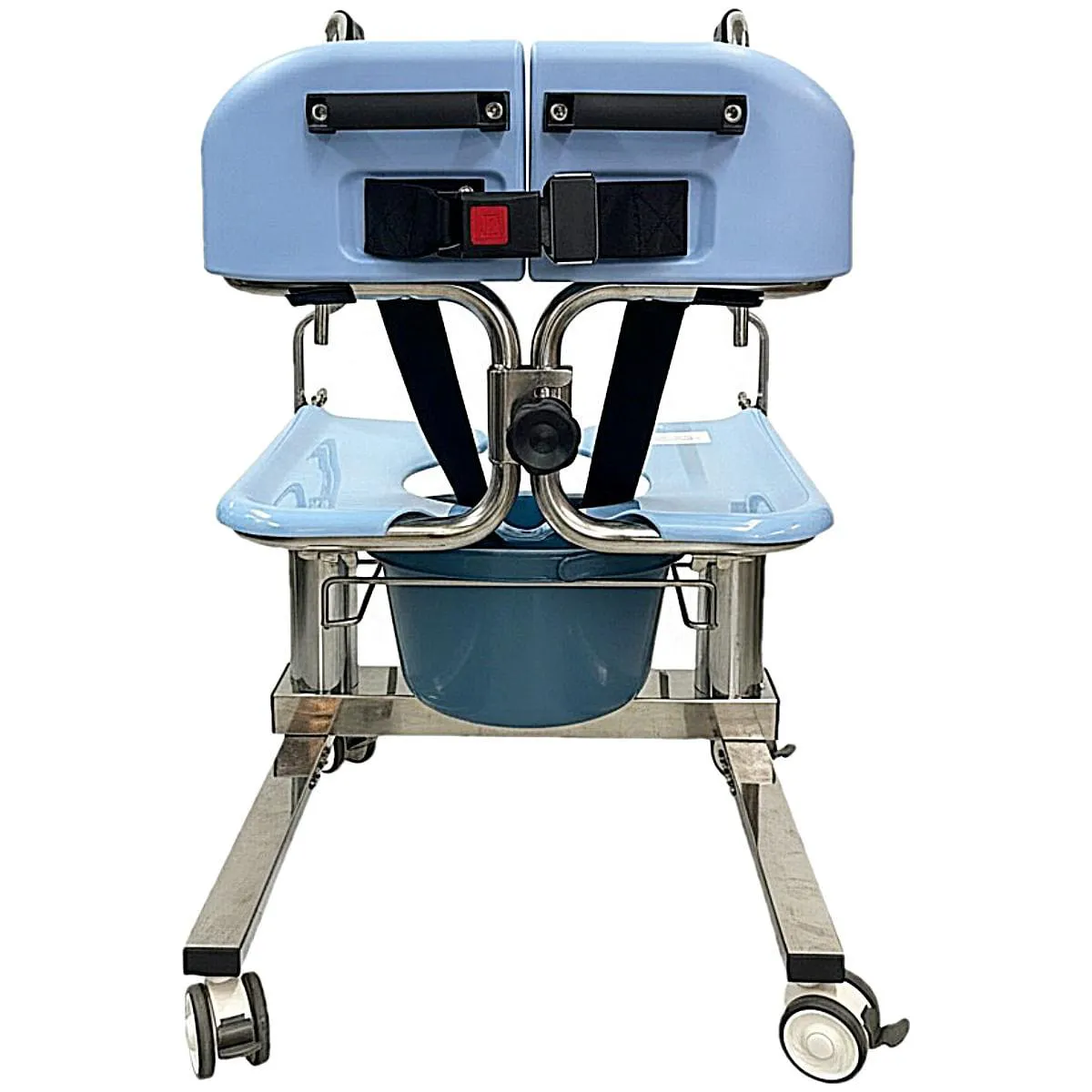 A Cadeira de Transferência e Banho Multiuso em Aço Inoxidável com rodas foi projetada com um mecanismo que eleva o paciente enquanto sentado.