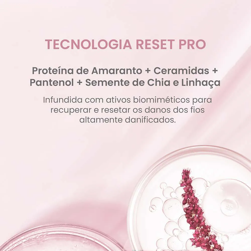 Sua impressionante fórmula RESET PRO é capaz de restaurar a hidratação, nutrição e reconstrução dos fios para RESETAR os danos e recuperar a saúde dos fios altamente danificados. Infundida com Pantenol, Semente de Chia e Linhaça, Ceramidas e Proteína do Amaranto garante 95% de reparação instantânea aos cabelos. Nossas fórmulas de alta performance são livres de crueldade animal, e 100% veganas com ativos naturais em uma composição responsável e gentil para o planeta.