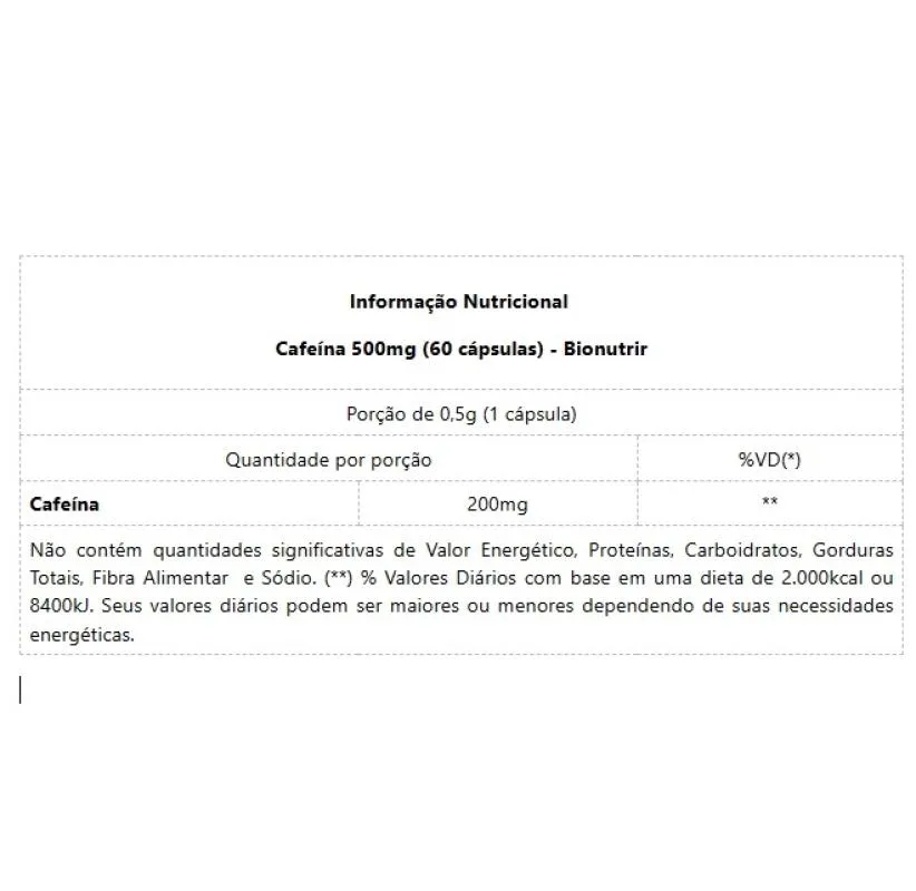 Cafeína 500mg (60 caps) - Bionutrir A cafeína em cápsulas, também conhecida como cafeína anidra, é um suplemento alimentar que serve como estimulante cerebral, podendo ser usado para melhorar o desempenho durante estudos e trabalho, além de também poder ser indicado para pessoas que praticam atividades físicas intensas como atletas e também por quem deseja emagrecer, pois acelera o metabolismo, favorece a queima de gordura e melhora a disposição. As cápsulas de cafeína são produzidas através da extração da cafeína dos alimentos por meio de um processo de desidratação e purificação, o que a torna a cafeína em cápsulas mais concentrada e, portanto, mais potente do que a cafeína normal. Além disso, ao ser ingerida, a cafeína anidra é absorvida rapidamente pelo intestino, iniciando seus efeitos estimulante Benefícios: * Melhorar a atenção e a concentração;* Melhorar a memória e a capacidade de aprendizado;* Aumentar a força e a resistência muscular;* Aumentar o desempenho da atividade física;* Diminuir o cansaço;* Melhorar o humor;* Estimular a disposição e o bem-estar;* Melhorar o raciocínio e a velocidade processamento da informação;* Melhorar a respiração;* Diminuir a dor de cabeça;* Reduzir a percepção de dor.