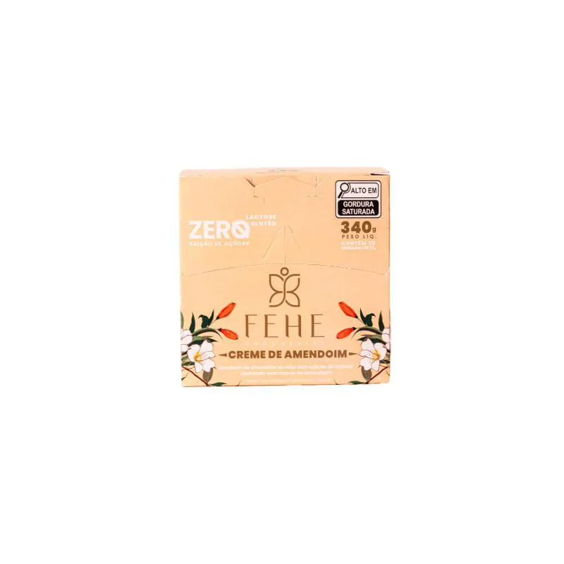 Os bombons da Fehe são elaborados com chocolate ao leite e recheio de creme de amendoim, a composição é zero adição de açúcares, sem soja, glúten e lactose. A caixa de bombom vem com 20 unidades e cada bombom possui 17g, já embalados em porções individuais.