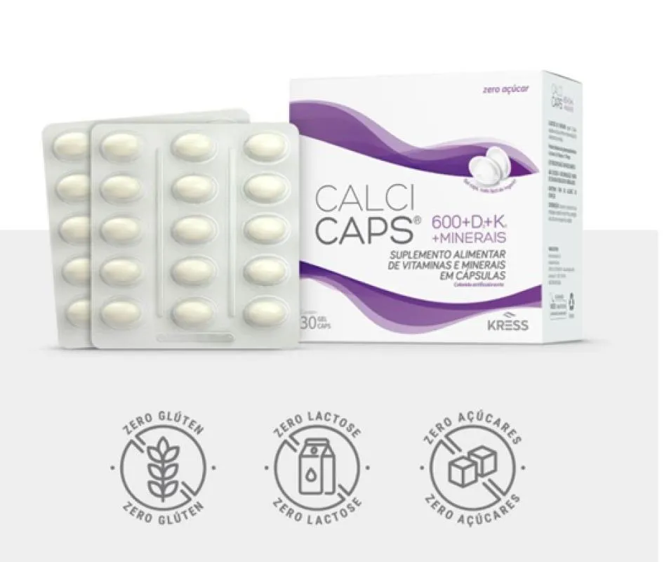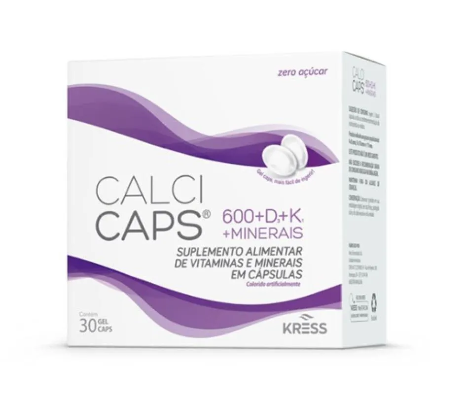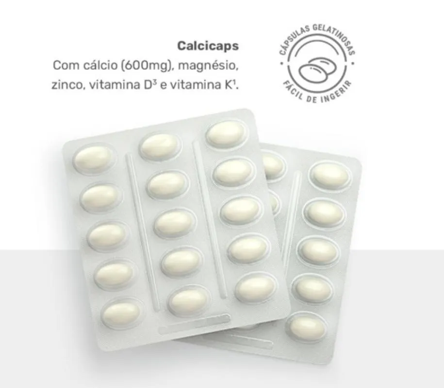 Calcicaps é um suplemento com cálcio + vitaminas e minerais, especialmente desenvolvido para a manutenção de ossos e dentes. Calcicaps contém uma dose excelente de cálcio (600mg por porção), além de ser enriquecido com vitamina D3, vitamina K1, magnésio e zinco, combinação que favorece uma melhor absorção do cálcio.