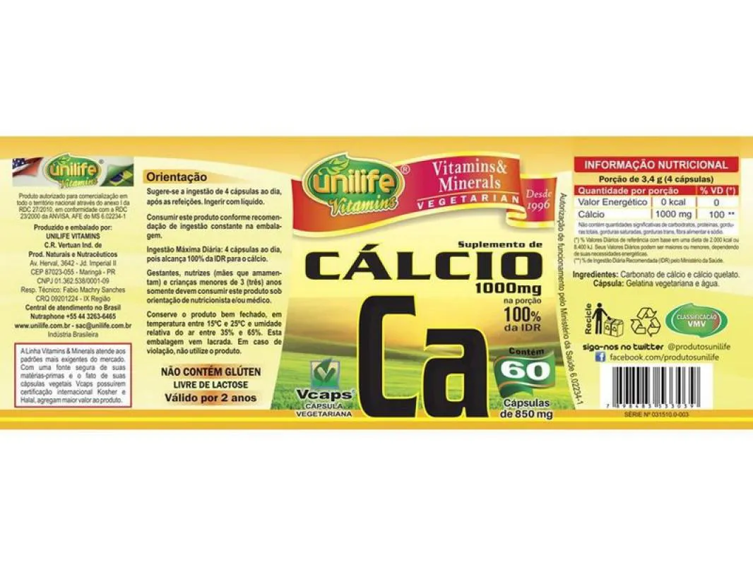 O Cálcio da Unilife tem como finalidade melhorar a longevidade dos seus ossos, em sua composição não possui nada que nosso corpo já não conheça, pois o Cálcio Quelato é uma substancia natural já produzida em pequenas quantidades pelo nosso corpo, portanto a suplementação se torna muito interessante, pois a ausência dessas substancias podem ser muito prejudicial a sua longevidade, apesar de não danificar de forma instantânea sua qualidade de vida com o passar dos anos você verá diversas complicações que irão surgir pela ausência de Cálcio, pois mesmo produzindo de forma natural aos 35 anos de idade o nosso organismo começará a diminuir a sua velocidade de absorção de diversas substancias, incluindo o Cálcio, então caso ocorra a ausência dessa substancia em qualquer idade a longevidade será afetada de uma forma bem intensa.Quais são os benefícios em utilizar o Cálcio Quelato 60 cápsulas da Unilife em minha dieta?