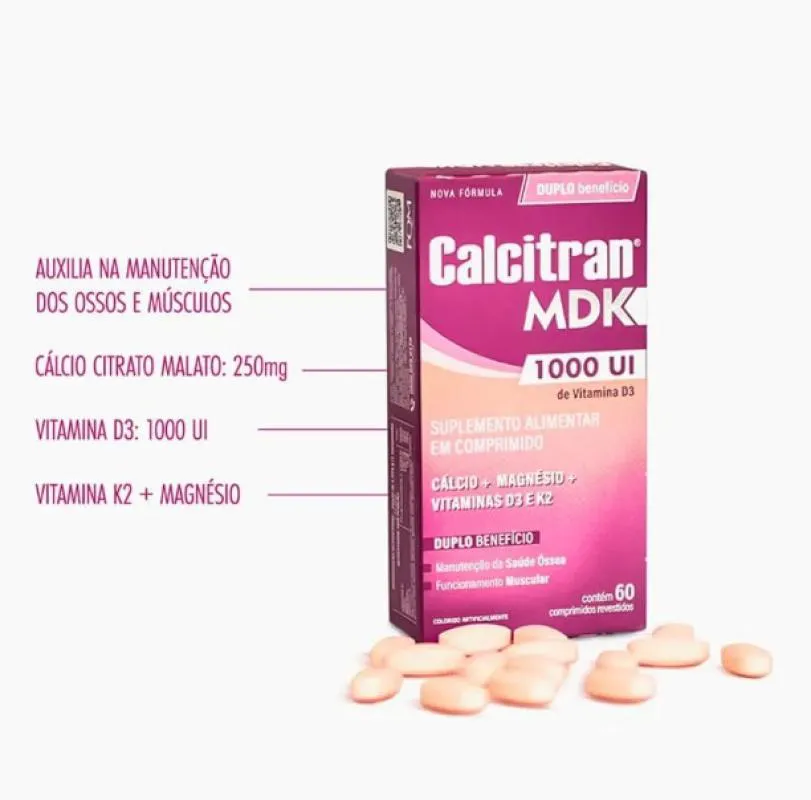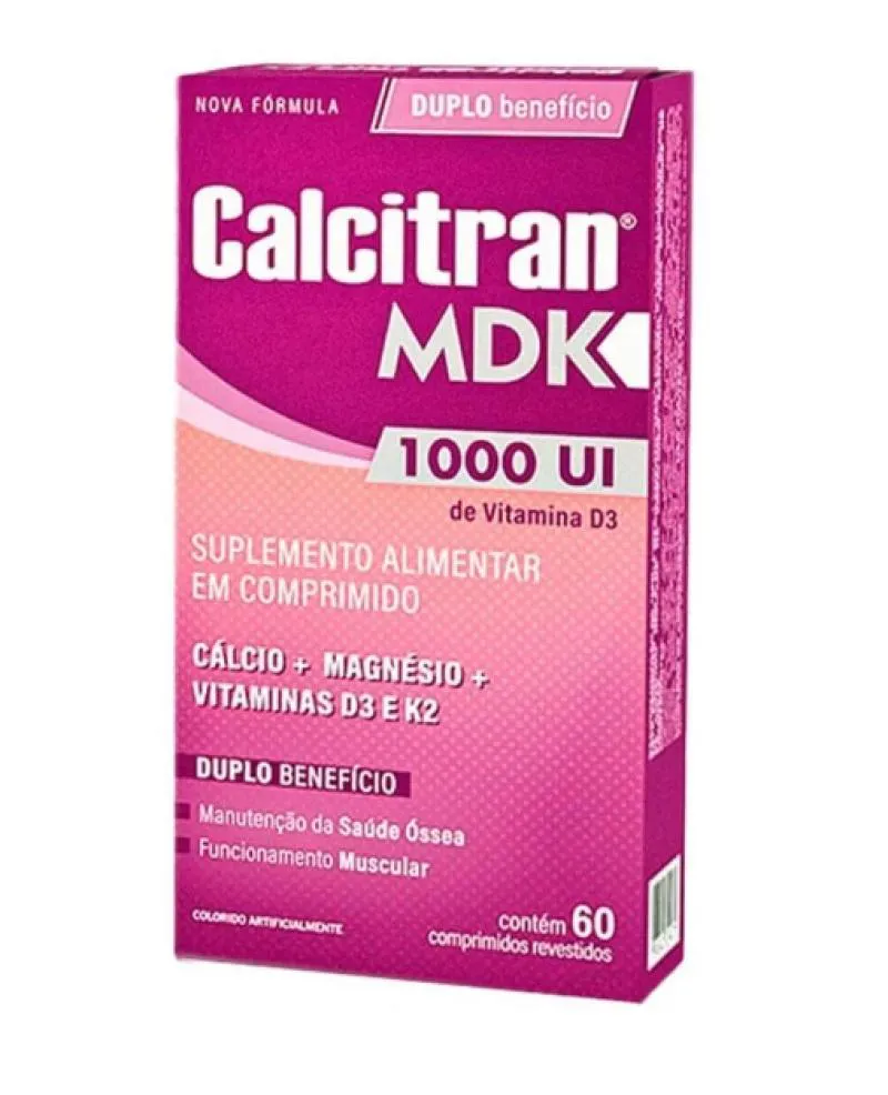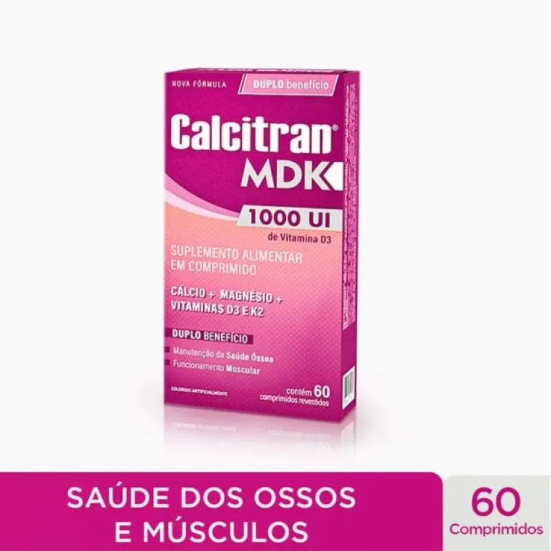 Calcitran MDK é um suplemento de Cálcio com Magnésio e Vitamina D3 e K2, com duplo benefício: auxilia na manutenção da saúde óssea e no funcionamento muscular. - Suplemento de Cálcio (cálcio citrato malato) com Magnésio e Vitamina D3 e K2 - 250mg de Cálcio + 126mg de Magnésio + 1.000UI de Vitamina D3 + 18ug de Vitamina K2 (por porção). - Duplo benefício: manutenção da saúde dos ossos e músculos. - Auxilia na formação e manutenção de ossos e dentes. - Auxilia no funcionamento muscular. - A vitamina d auxilia na absorção de cálcio - A vitamina D auxilia no funcionamento do sistema imune. - Rico em Vitamina D. - Uso adulto e oral.