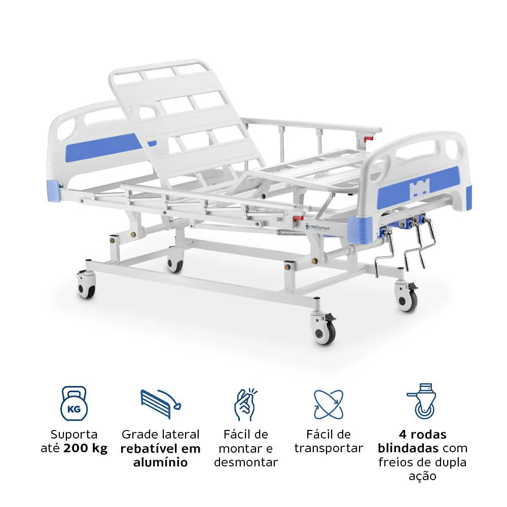 A Cama Hospitalar DX3 movimentos Dellamed é um equipamento projetado para proporcionar conforto e cuidados adequados a usuários acamados, especialmente idosos. Com uma capacidade de suporte de até 200 kg, ela oferece robustez e segurança aos seus usuários. Equipada com três movimentos ajustáveis e cinco posições, esta cama permite ao paciente encontrar a posição mais adequada para descansar e promover seu bem-estar. Com um sistema manual de três manivelas, proporciona facilidade de ajuste e operação, sendo uma escolha ideal para ambientes hospitalares e de cuidados domiciliares.