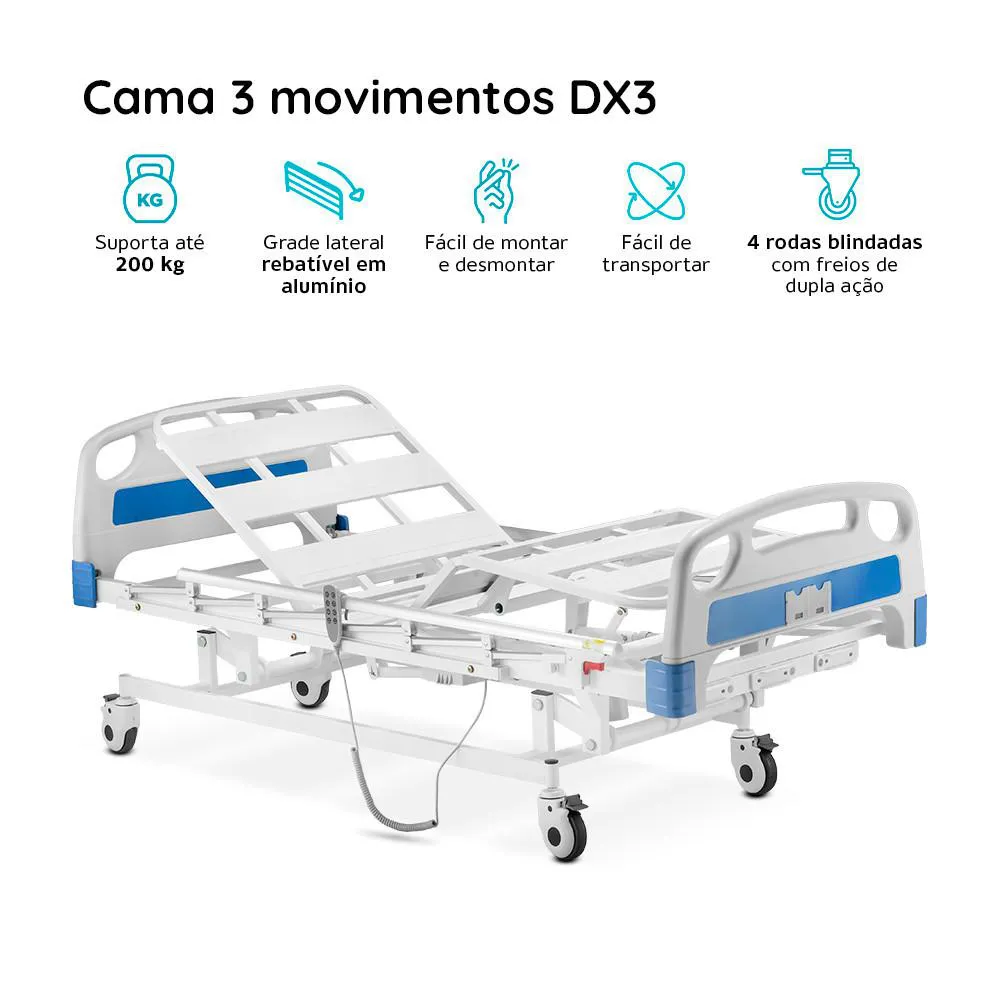A Cama Hospitalar DX 3 movimentos Dellamed é um equipamento projetado para proporcionar conforto e cuidados adequados a usuários acamados. Com capacidade de suportar até 150 kg, ela oferece robustez e segurança aos seus usuários. Possui três movimentos ajustáveis, e 5 posições, permitindo ao paciente encontrar a posição mais adequada para descansar.