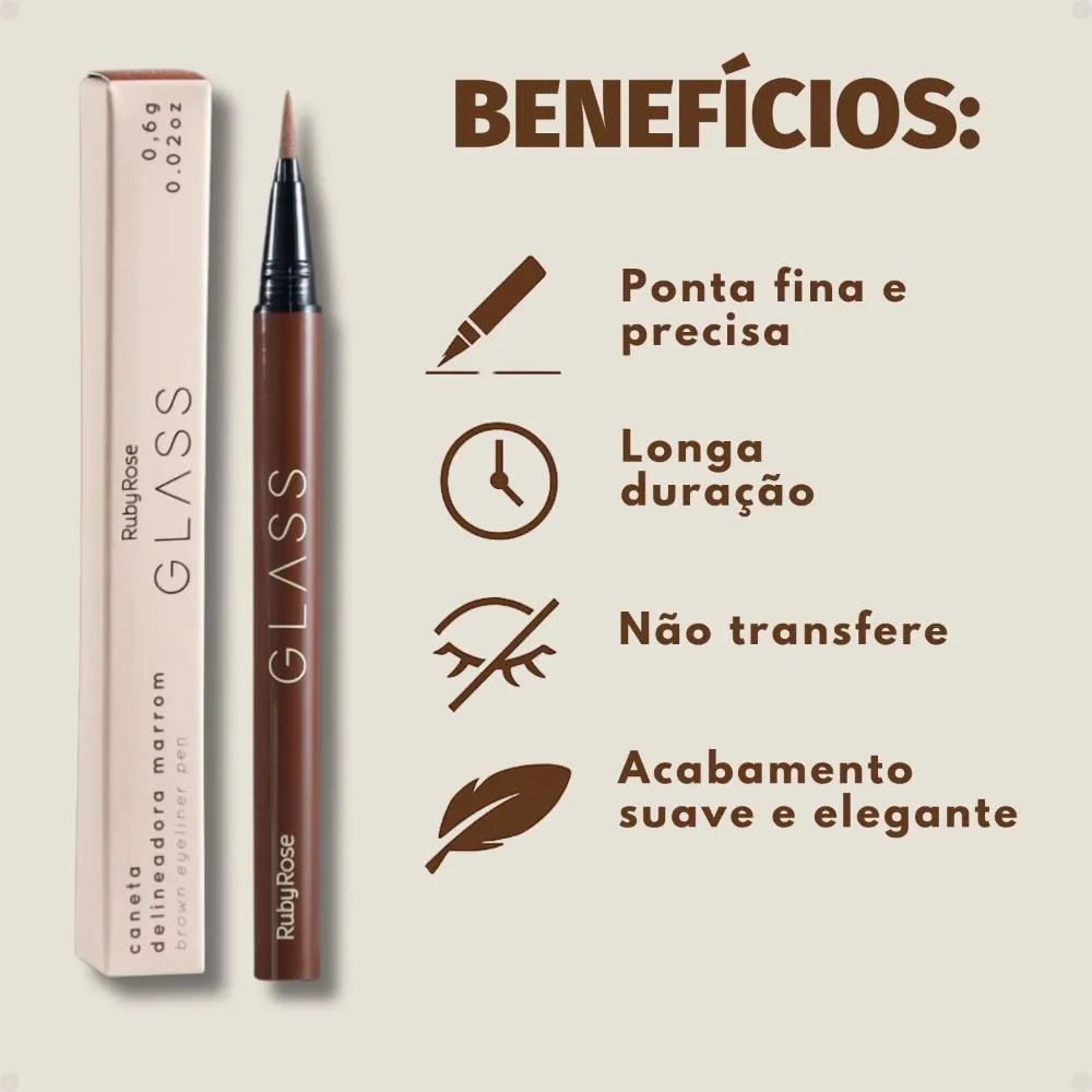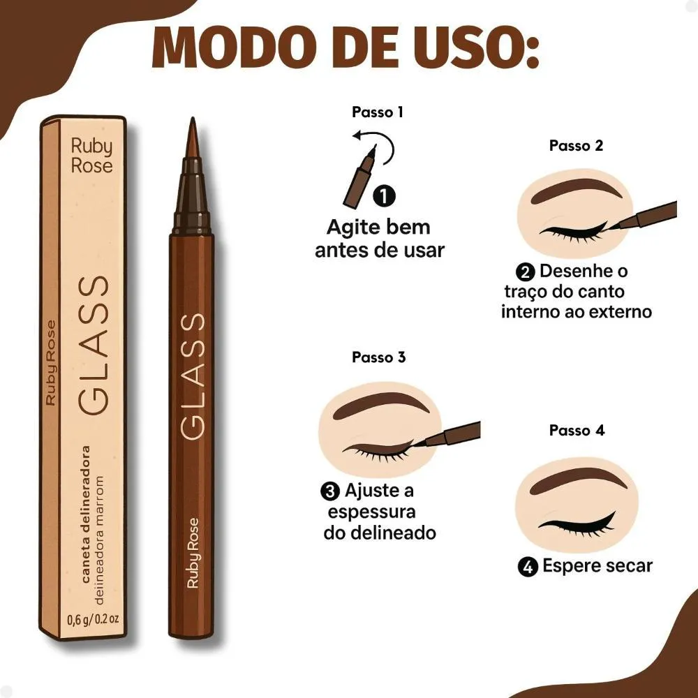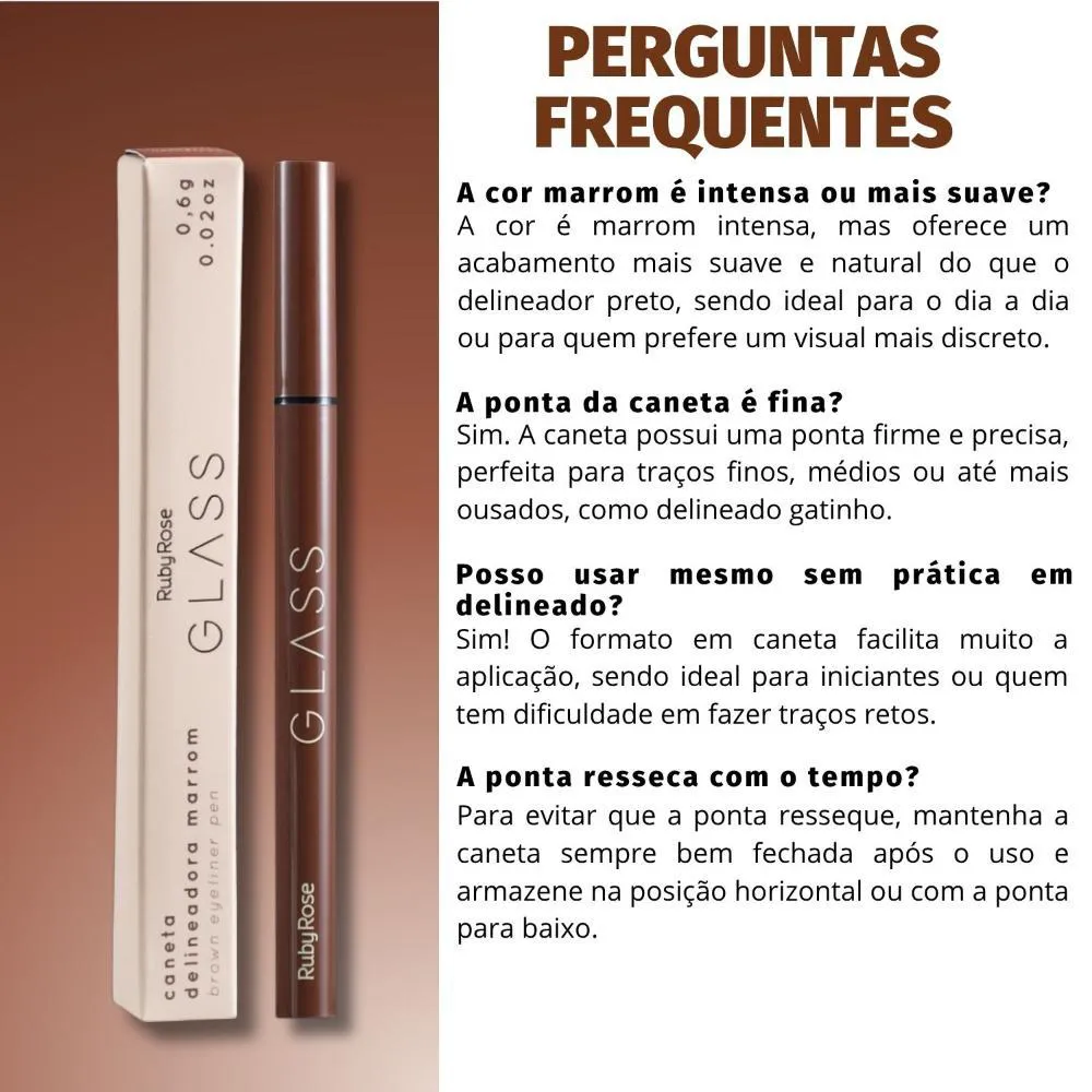 Caneta Delineadora Marrom Ruby Rose Glass BE01 Realce seu olhar com elegância e suavidade com a Caneta Delineadora Marrom Ruby Rose Glass. Com fórmula de alta pigmentação e ponta precisa, ela permite traços finos ou marcantes com total controle, ideal para criar desde o clássico delineado gatinho até efeitos gráficos modernos. Sua tonalidade marrom oferece um visual mais suave e natural que o preto tradicional, sendo perfeita para o dia a dia ou para quem busca um acabamento mais leve e sofisticado. A textura líquida de secagem rápida garante alta durabilidade, sem borrar, escorrer ou transferir ao longo do dia. A embalagem em formato de caneta facilita a aplicação, até mesmo para iniciantes, proporcionando um delineado firme, uniforme e sem esforço. . Modo de uso: Agite antes de usar. Faça o traço a partir do canto interno da pálpebra para o externo, rente à raiz dos cílios. . Perguntas Frequentes A cor marrom é intensa ou mais suave? A cor é marrom intensa, mas oferece um acabamento mais suave e natural do que o delineador preto, sendo ideal para o dia a dia ou para quem prefere um visual mais discreto. A ponta da caneta é fina? Sim. A caneta possui uma ponta firme e precisa, perfeita para traços finos, médios ou até mais ousados, como delineado gatinho. É à prova d’água? Ela tem boa resistência à umidade, mas não é completamente à prova d’água. Para situações que exigem alta resistência à água, é recomendado usar um delineador específico para isso. Posso usar mesmo sem prática em delineado? Sim! O formato em caneta facilita muito a aplicação, sendo ideal para iniciantes ou quem tem dificuldade em fazer traços retos. A ponta resseca com o tempo? Para evitar que a ponta resseque, mantenha a caneta sempre bem fechada após o uso e armazene na posição horizontal ou com a ponta para baixo. . Código de Registro Sanitário (ANVISA) 25351.341545/2024-08