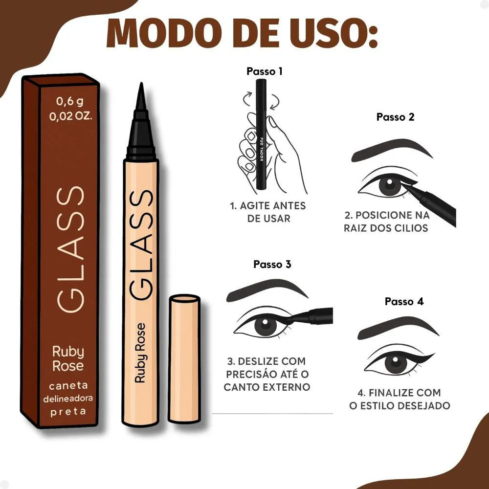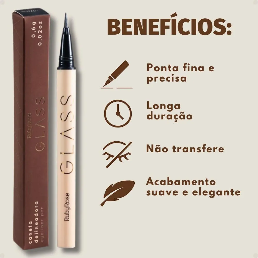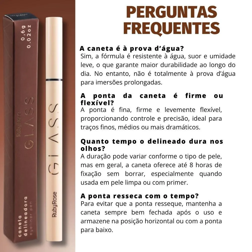 Caneta Delineadora Preta Ruby Rose Glass 0,6g Hb-524 A Caneta Delineadora Ruby Rose Glass HB-524 é o item indispensável para quem busca um olhar marcante, sofisticado e com acabamento profissional. Com cor preta intensa e fórmula de alta durabilidade, ela permite traços precisos e impactantes, seja para um delineado discreto para o dia a dia ou um look poderoso para a noite. Sua ponta fina e flexível oferece controle total durante a aplicação, facilitando a criação de diversos estilos — desde o clássico gatinho até traços gráficos e ousados. Além disso, a caneta possui secagem rápida, o que evita borrões e proporciona um acabamento uniforme em poucos segundos. A fórmula é resistente à água e ao suor, garantindo que o delineado permaneça intacto ao longo do dia, mesmo em condições de calor ou umidade. Ideal para todos os tipos de pele e níveis de habilidade, desde iniciantes até maquiadores profissionais. . Modo de uso: Agite antes de usar. Faça o traço a partir do canto interno da pálpebra para o externo, rente à raiz dos cílios. . Perguntas Frequentes A caneta é à prova d’água? Sim, a fórmula é resistente à água, suor e umidade leve, o que garante maior durabilidade ao longo do dia. No entanto, não é totalmente à prova d’água para imersões prolongadas. A ponta da caneta é firme ou flexível? A ponta é fina, firme e levemente flexível, proporcionando controle e precisão, ideal para traços finos, médios ou mais dramáticos. Quanto tempo o delineado dura nos olhos? A duração pode variar conforme o tipo de pele, mas em geral, a caneta oferece até 8 horas de fixação sem borrar, especialmente quando usada em pele limpa ou com primer. É fácil de remover? Sim. Apesar da boa fixação, pode ser removida facilmente com demaquilante bifásico ou água micelar. A caneta seca com o tempo? Como toda caneta delineadora, pode ressecar se não for armazenada corretamente. Guarde sempre com a ponta virada para baixo e bem tampada após o uso. . Código de Registro Sanitário (ANVISA) 25351.428656/2023-39
