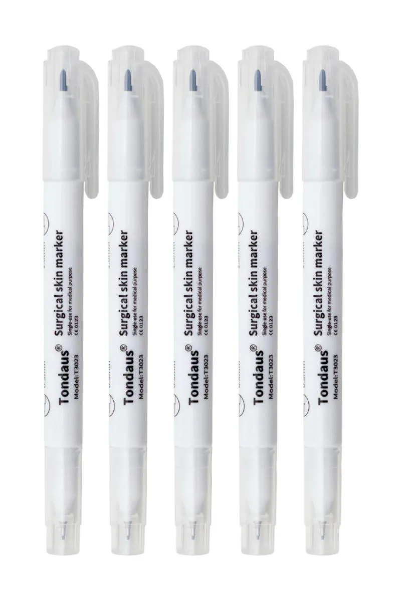 CANETA MARCADORA DE PELE FREEHAND TATUAGEM TONDAUS 5UN A Caneta de Marcação Cirúrgica Tondaus é visível até 10 vezes mais do que a tinta tradicional, eliminando a necessidade de remarcar o paciente na sala de operação. Ideal para procedimentos ortopédicos, espinhais, microblanding, marcação de sobrancelhas, tatuagens, e cirurgias plásticas que requerem marcação extensiva, como elevadores de mama e abdominoplastia. Também é perfeita para lipoaspiração e outros procedimentos que utilizam preparações agressivas como CHG. Indicações: Procedimentos ortopédicos e espinhais, microblanding para marcar sobrancelhas e tatuagens, procedimentos de cirurgia plástica com marcação extensiva (ex: elevadores de mama, abdominoplastia), Lipoaspiração (tumescente). Características:
