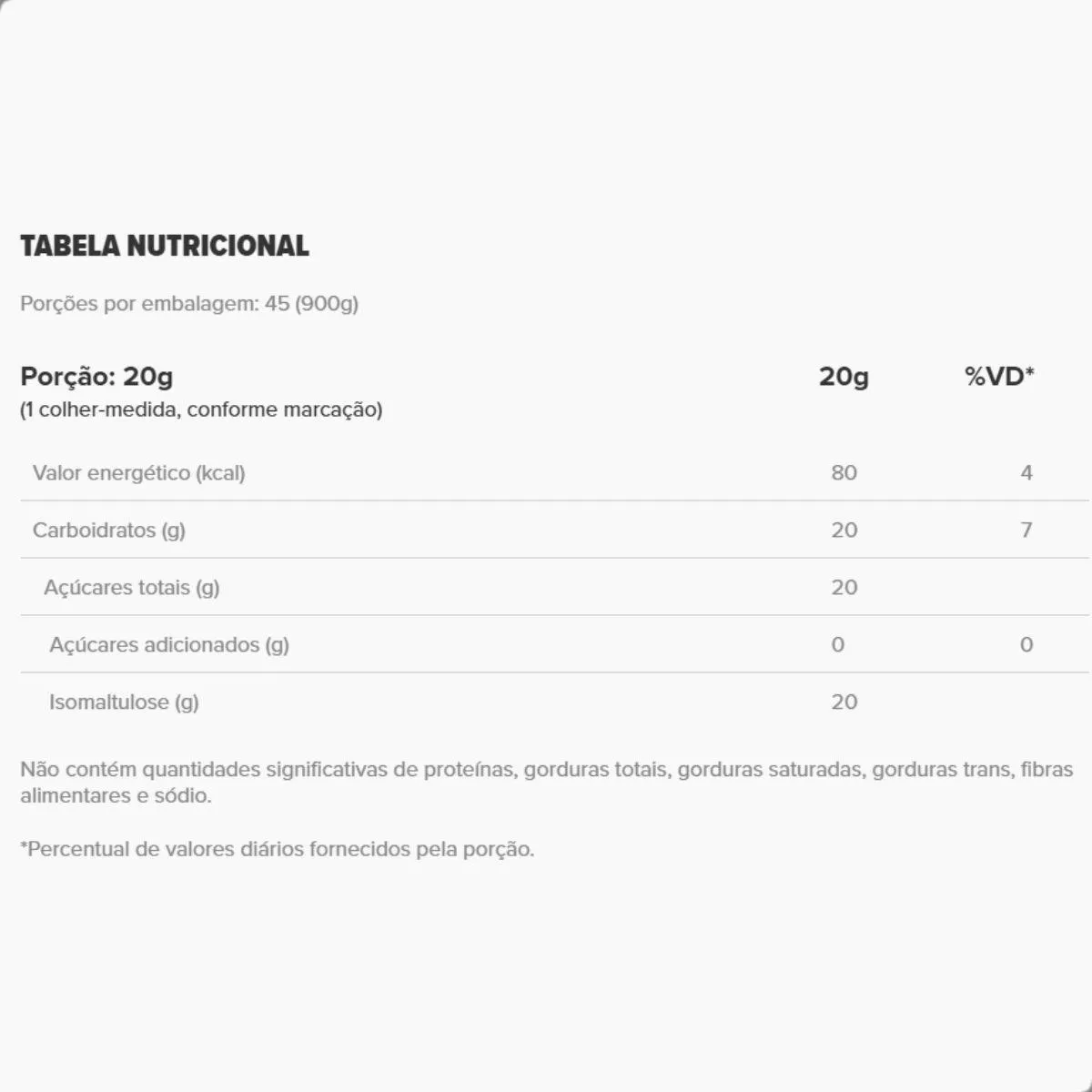 A fórmula contém somente isomaltulose (palatinose) obtida da beterraba, sem adição de açúcares refinados, glúten, lactose ou corantes. Sua digestão lenta favorece um fornecimento gradual de energia, respeitando a proposta de suporte nutricional.
