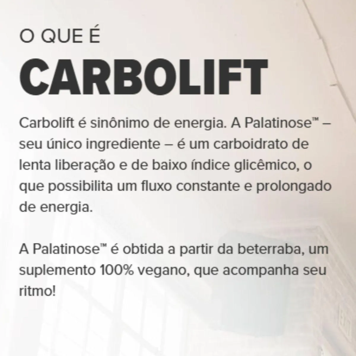 O diferencial do Carbolift está na pureza da palatinose, que pode ser usada como fonte de carboidratos de baixo índice glicêmico em diversas preparações, sem prometer vantagens de performance. A versão em maior volume atende a quem consome regularmente.