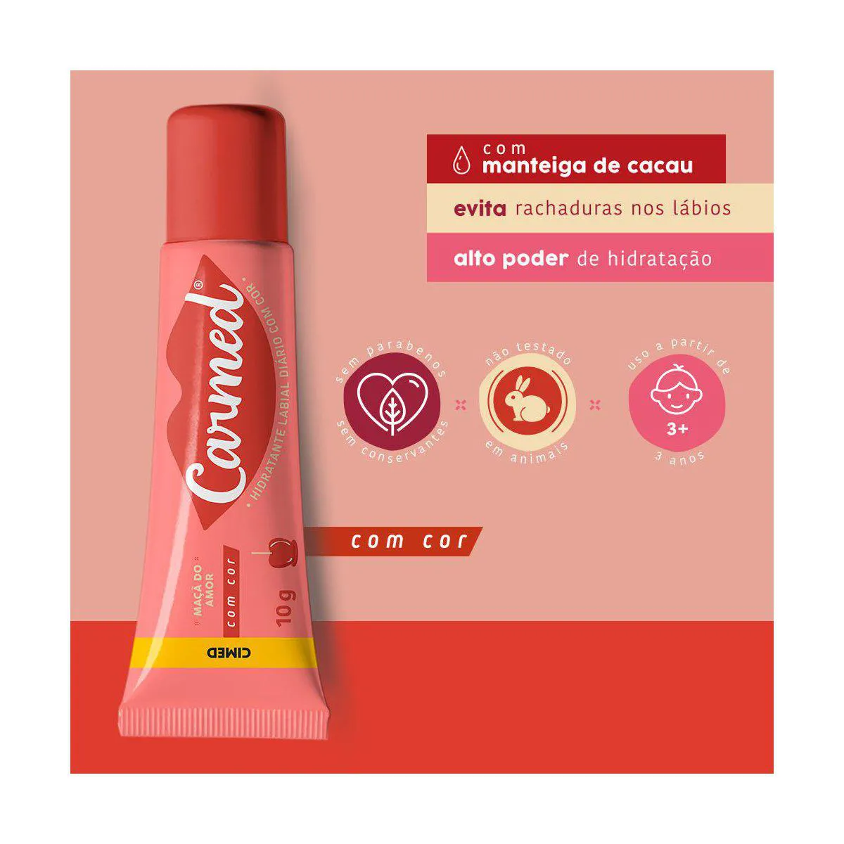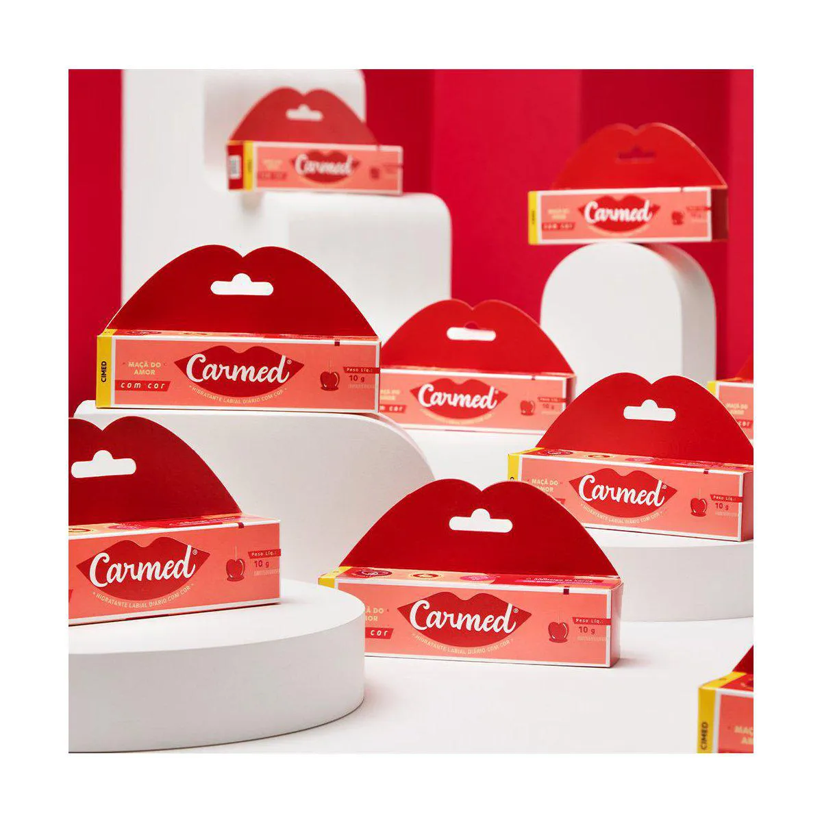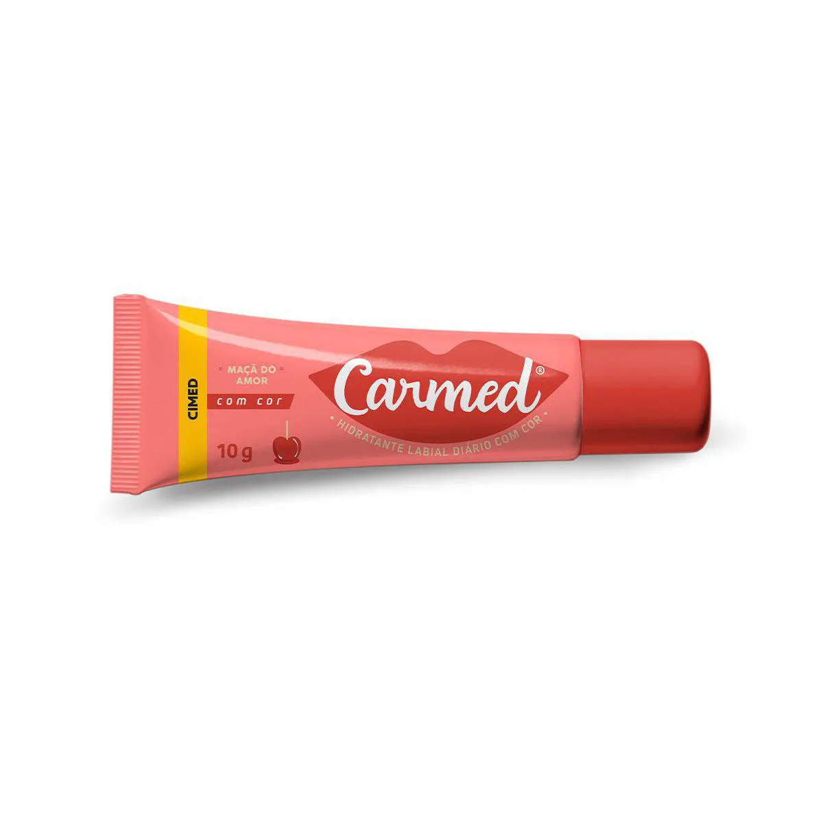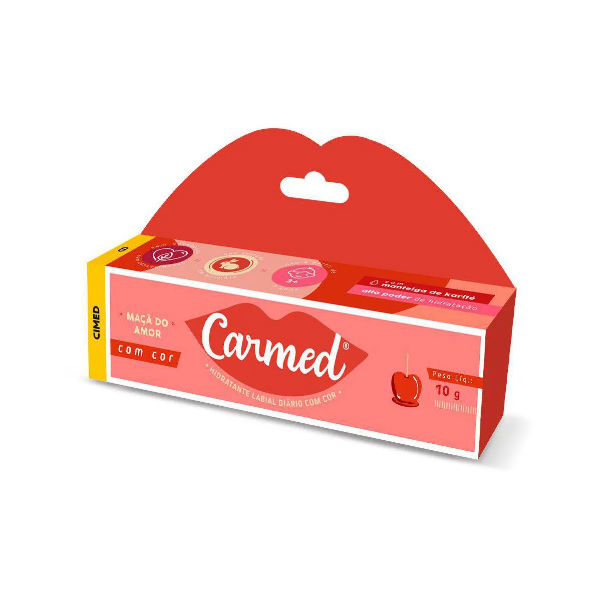 Carmed Maçã do Amor é um hidratante labial com cor vermelha, efeito gloss e delicioso aroma de Maçã do Amor.