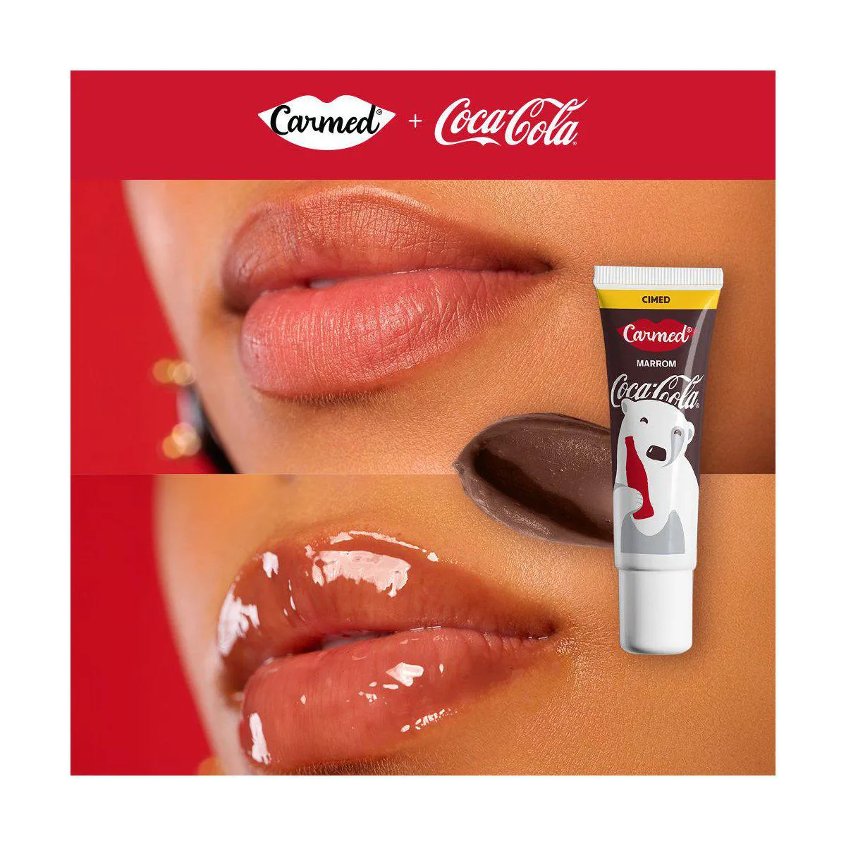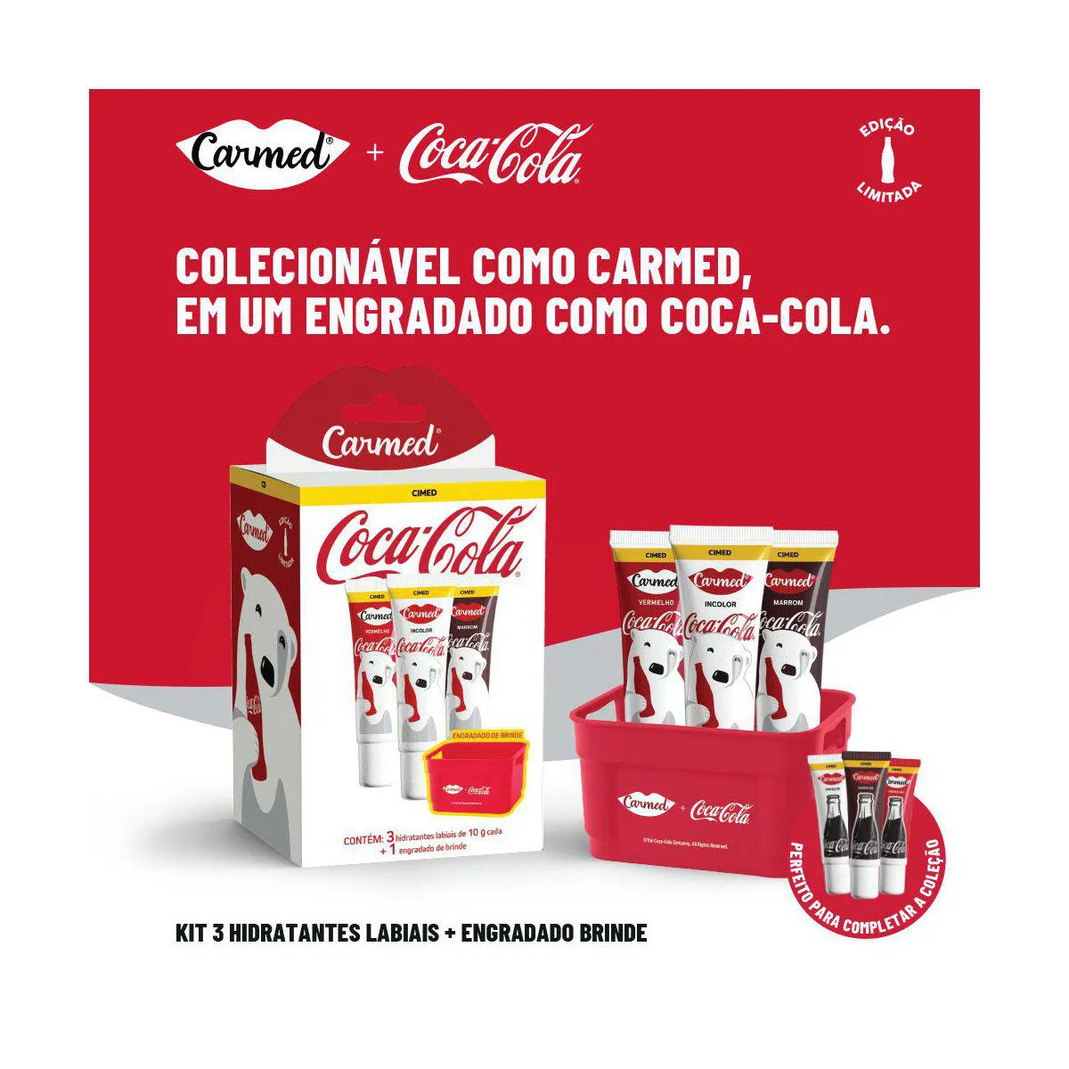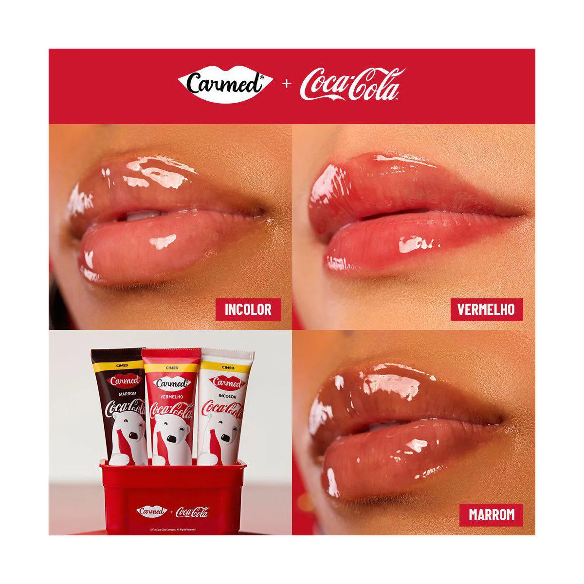 - Kit com hidratantes labiais Carmed Coca-Cola em versões vermelho, marrom e incolor.