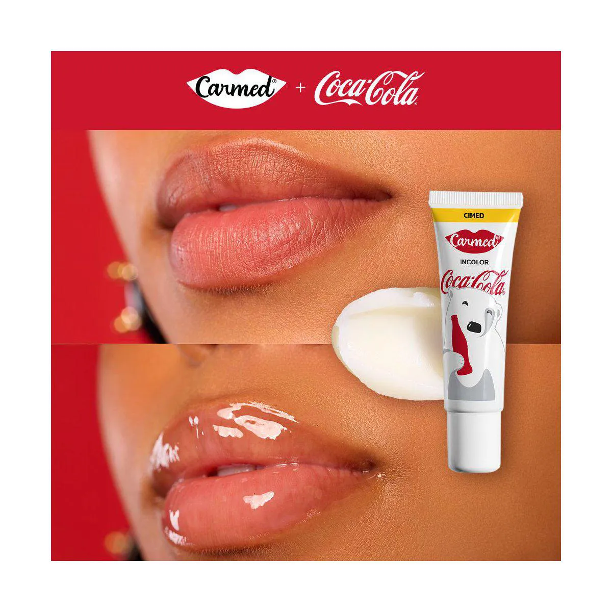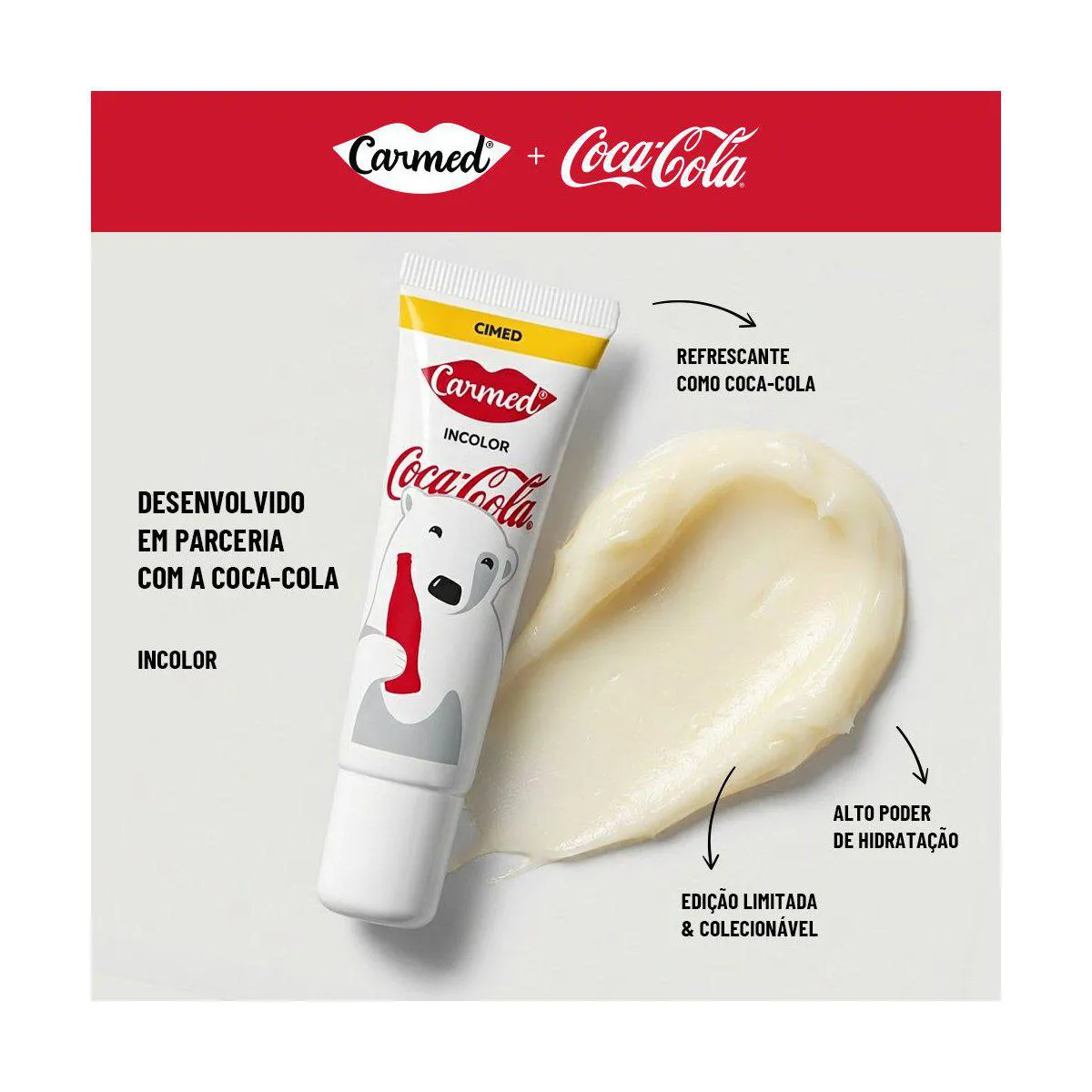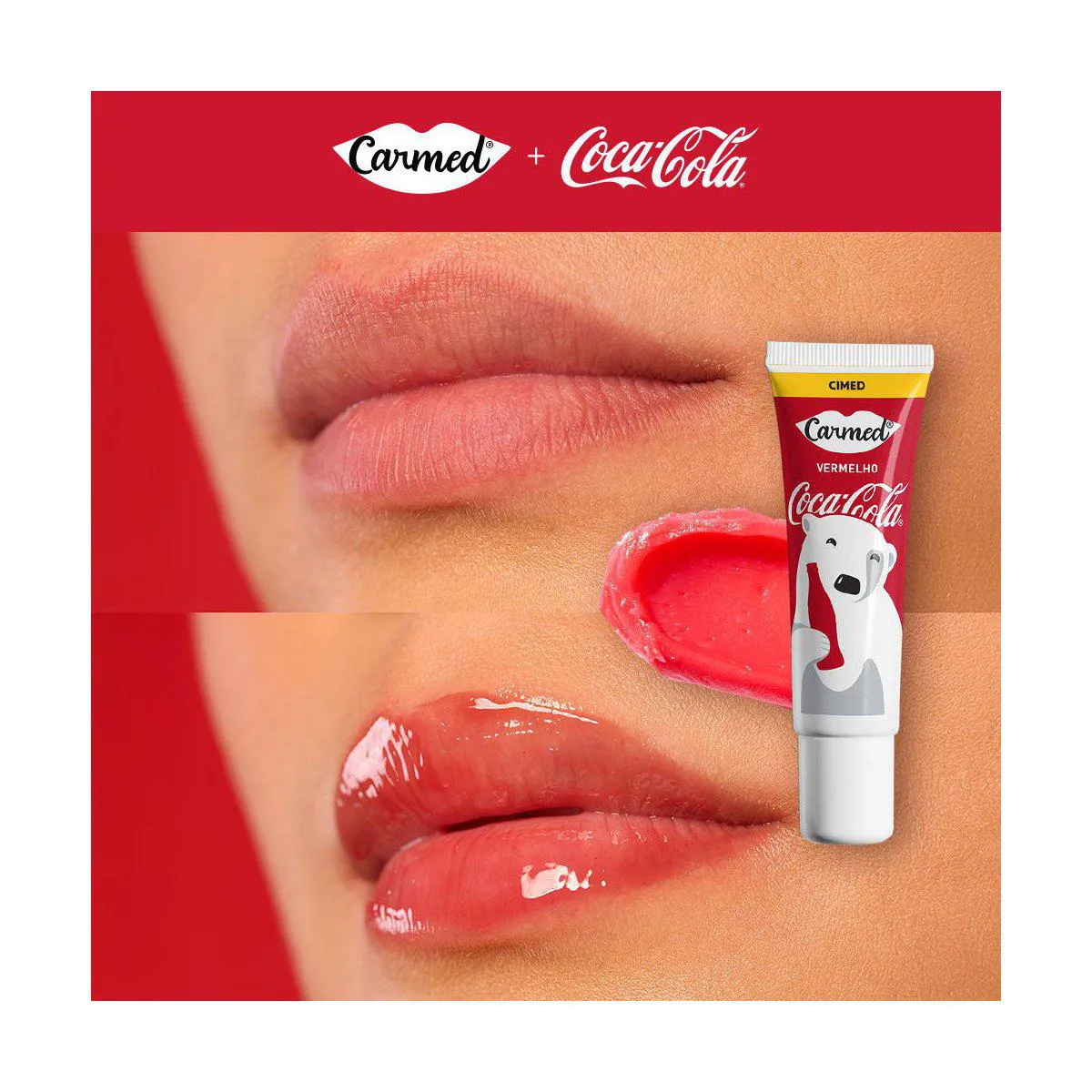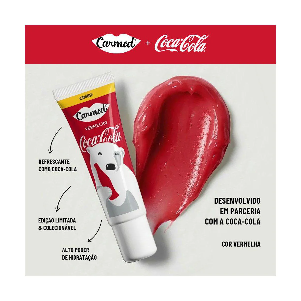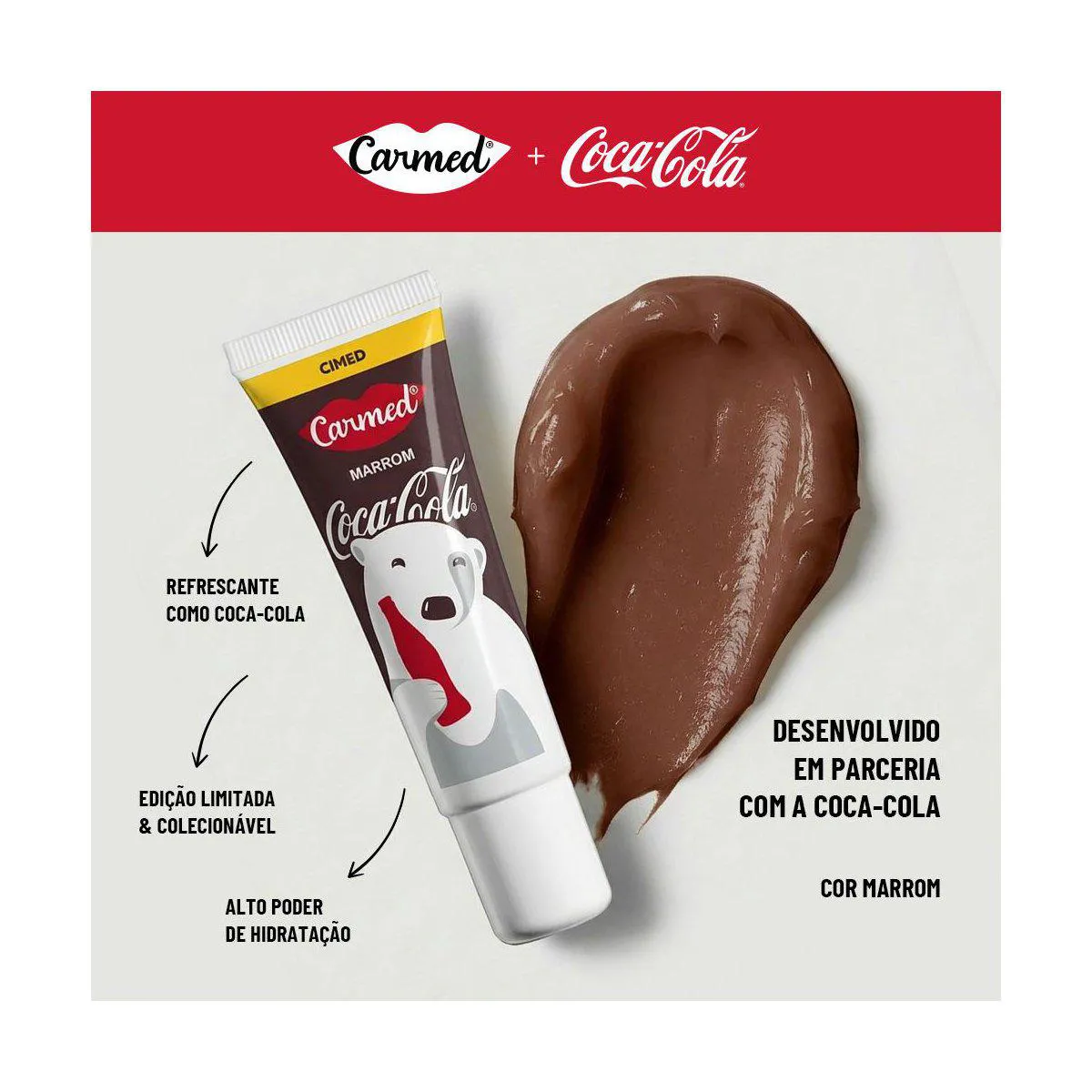 O Kit Carmed Coca-Cola Hidratante Labial é um conjunto de hidratantes labiais com três versões de cores diferentes (vermelho, marrom e incolor), desenvolvido com uma fórmula hidratante exclusiva Carmed e inspiração no sabor de Coca-Cola.