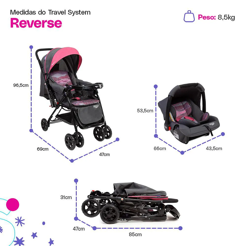 Carrinho com Bebê Conforto Travel System Reverse Duo Rosa Onda - Cosco Kids