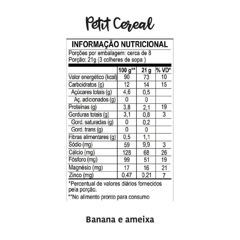 O Petit Cereal de aveia integral com banana e ameixa da Papapá foi desenvolvido para preparo instantâneo, ele pode ser feito como mingau ou adicionado nas receitas que seu filho mais gosta. Sua composição contém 51% de aveia integral e é fonte de fósforo, cálcio e magnésio.