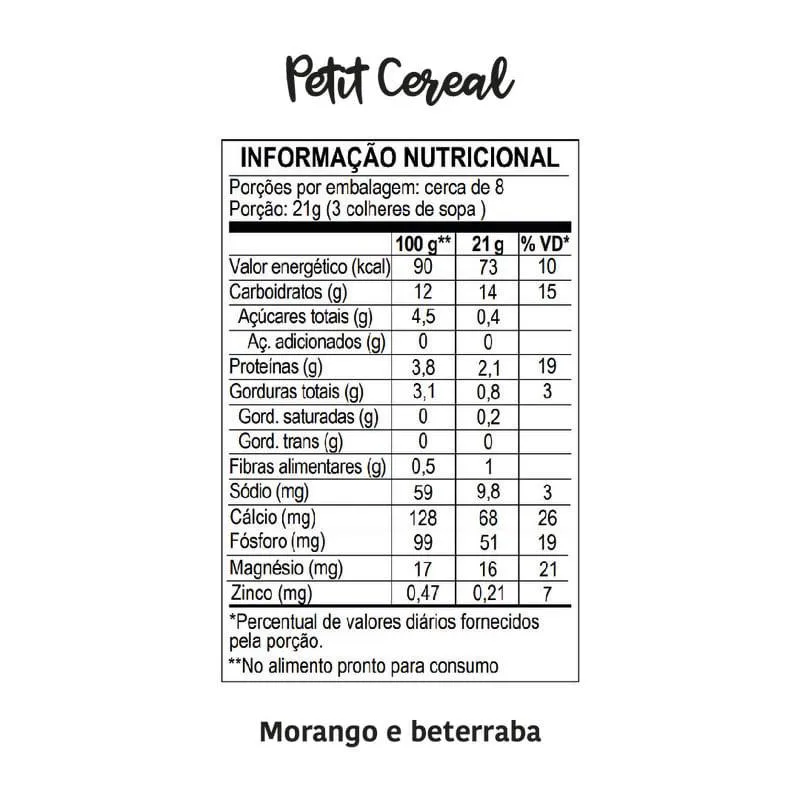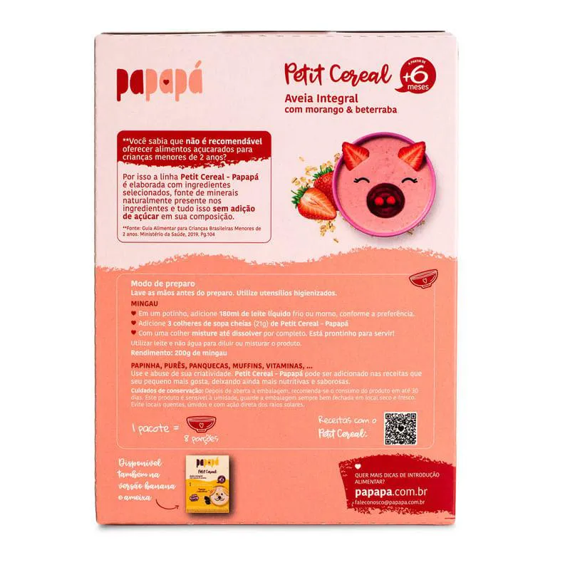 O Petit Cereal de aveia integral com morango e beterraba da Papapá foi desenvolvido para preparo instantâneo, ele pode ser feito como mingau ou adicionado nas receitas que seu filho mais gosta. Sua composição contém 51% de aveia integral e é fonte de fósforo, cálcio e magnésio.