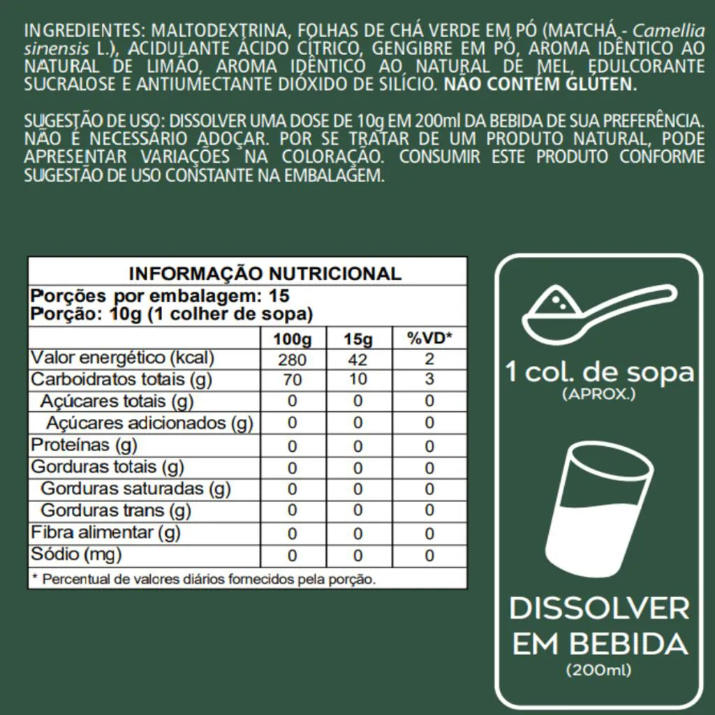 Composição: Maltodextrina, folhas de chá verde em pó (Matchá - Camellia sinensis L.), acidulante ácido cítrico, gengibre em pó, aroma idêntico ao natural de limão, aroma idêntico ao natural de mel, edulcorante sucralose e antiumectante dióxido de silício.