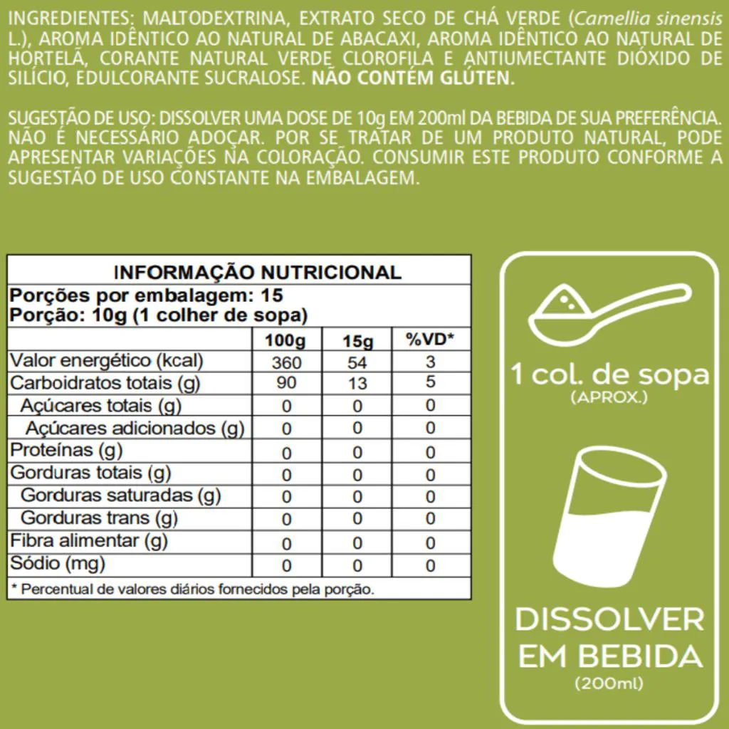 Composição: Maltodextrina, extrato seco de chá verde (Came.llia sine.nsis L.), aroma idêntico ao natural de abacaxi, aroma idêntico ao natural de hortelã, corante natural verde clorofila, antiumectante dióxido de silício e edulcorante sucralose.