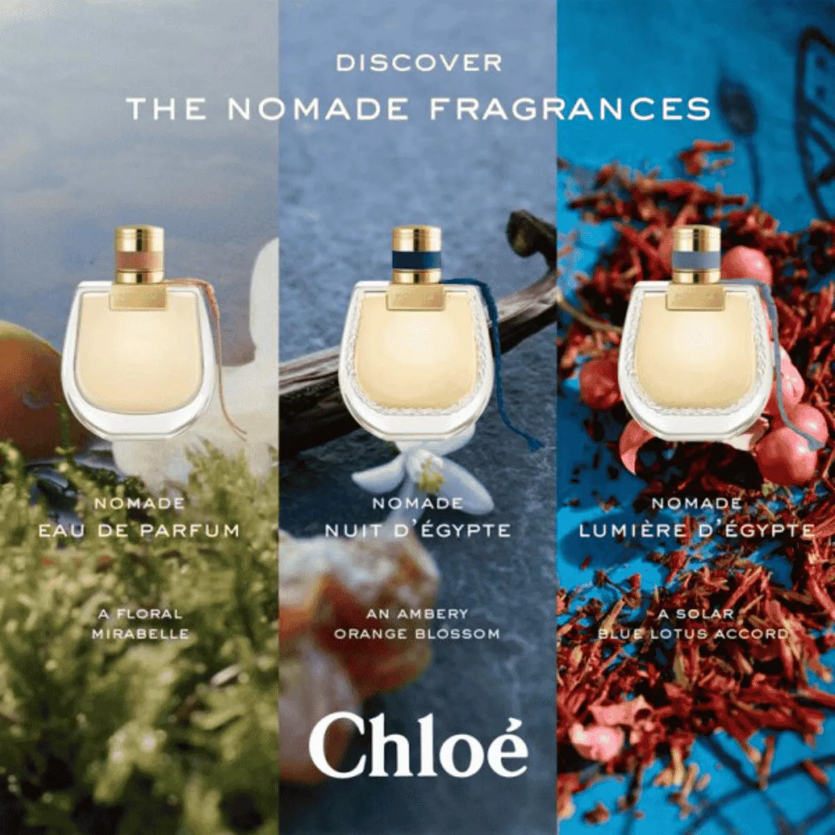 Para criar Nomade Lumière d'Égypte, Cécile Matton inspirou-se nas paisagens mágicas do Egito, desde as águas refrescantes do Nilo e a vegetação exuberante que cresce em suas margens até o calor do deserto mais além. Cada uma dessas paisagens é iluminada pela luz do sol egípcio, lindamente refletida neste mais recente capítulo da história de Chloé Nomade.