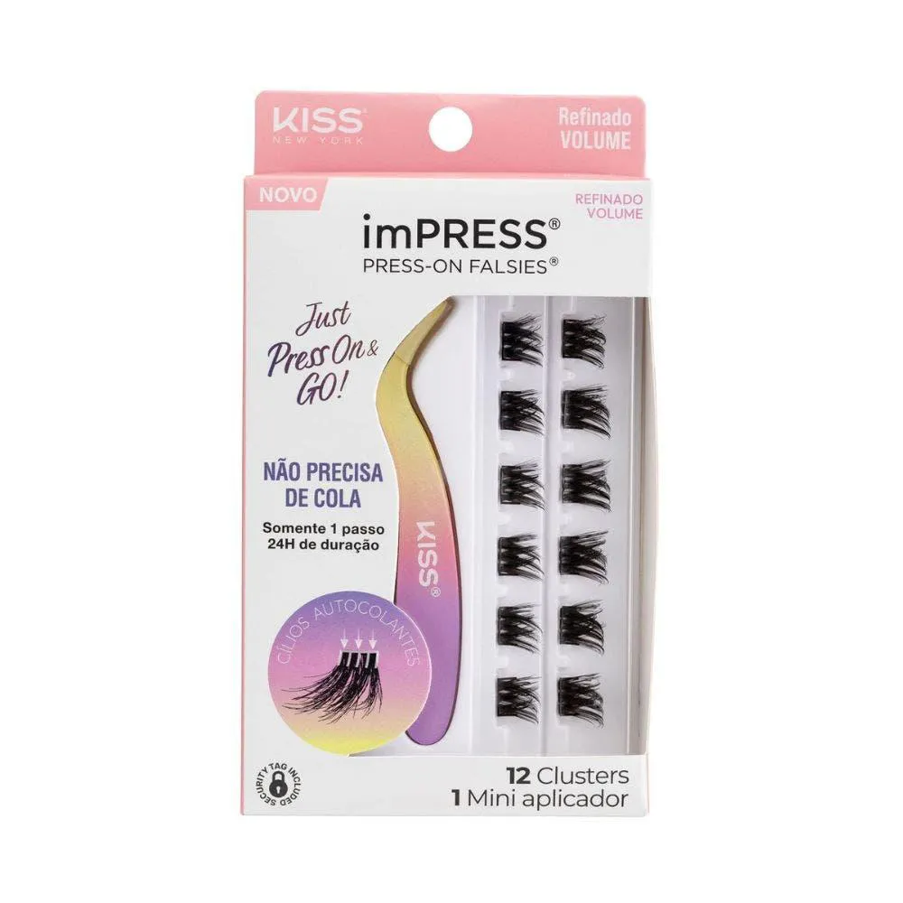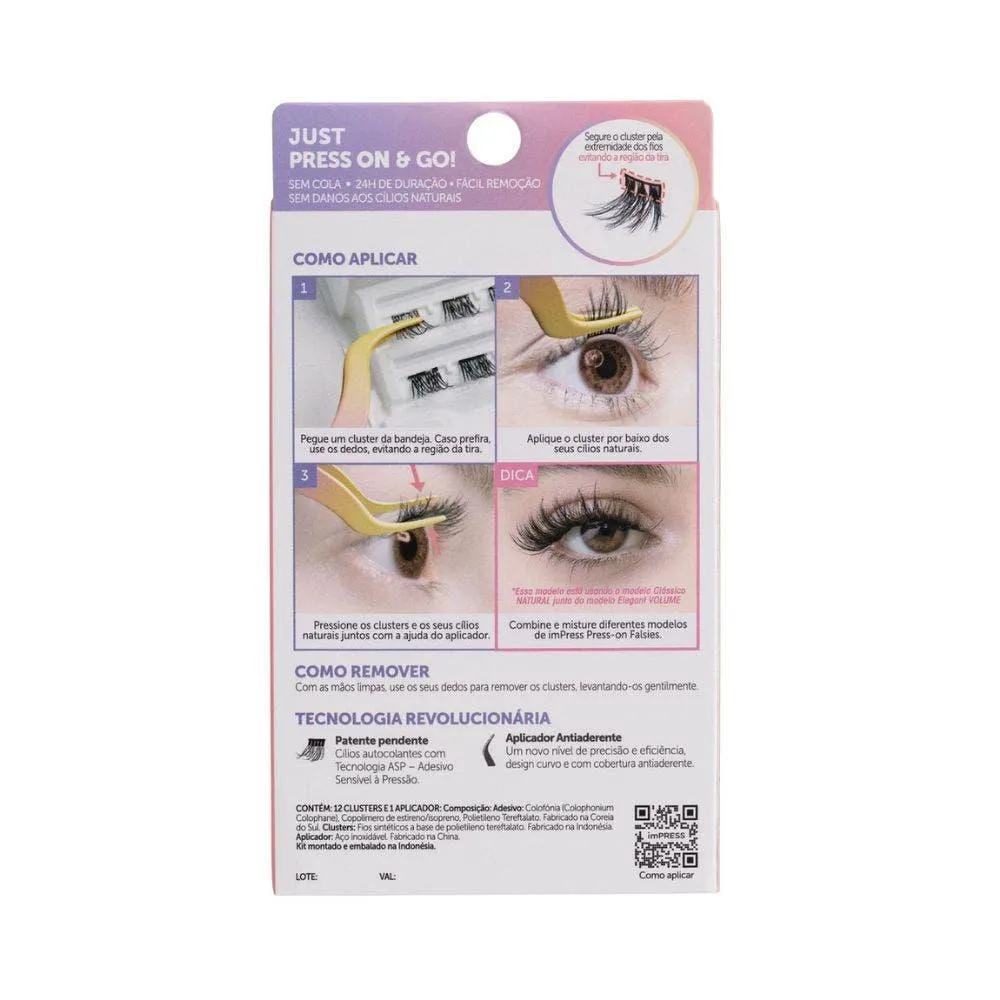 imPRESS Press-on Falsies é a primeira linha de cílios postiços autocolantes do mercado. Sem cola, sem tempo de secagem e sem danos aos cílios naturais. Com Tecnologia ASP (Adesivo Sensível à Pressão), a mesma das unhas imPRESS, os clusters de cílios possuem adesivos autocolantes que aderem instantaneamente ao cílios naturais. Com apenas 1 passo e em 10 segundos, garanta 24 horas de duração e aparência 100% natural. Nunca mais tenha medo de aplicar cílios postiços! O kit Mini é o ideal para quem quer experimentar a nova tecnologia, contém 12 clusters e um aplicador com um design único antiaderente e com uma curvatura que garante o ângulo perfeito para a aplicação dos seus imPRESS Press-on Falsies