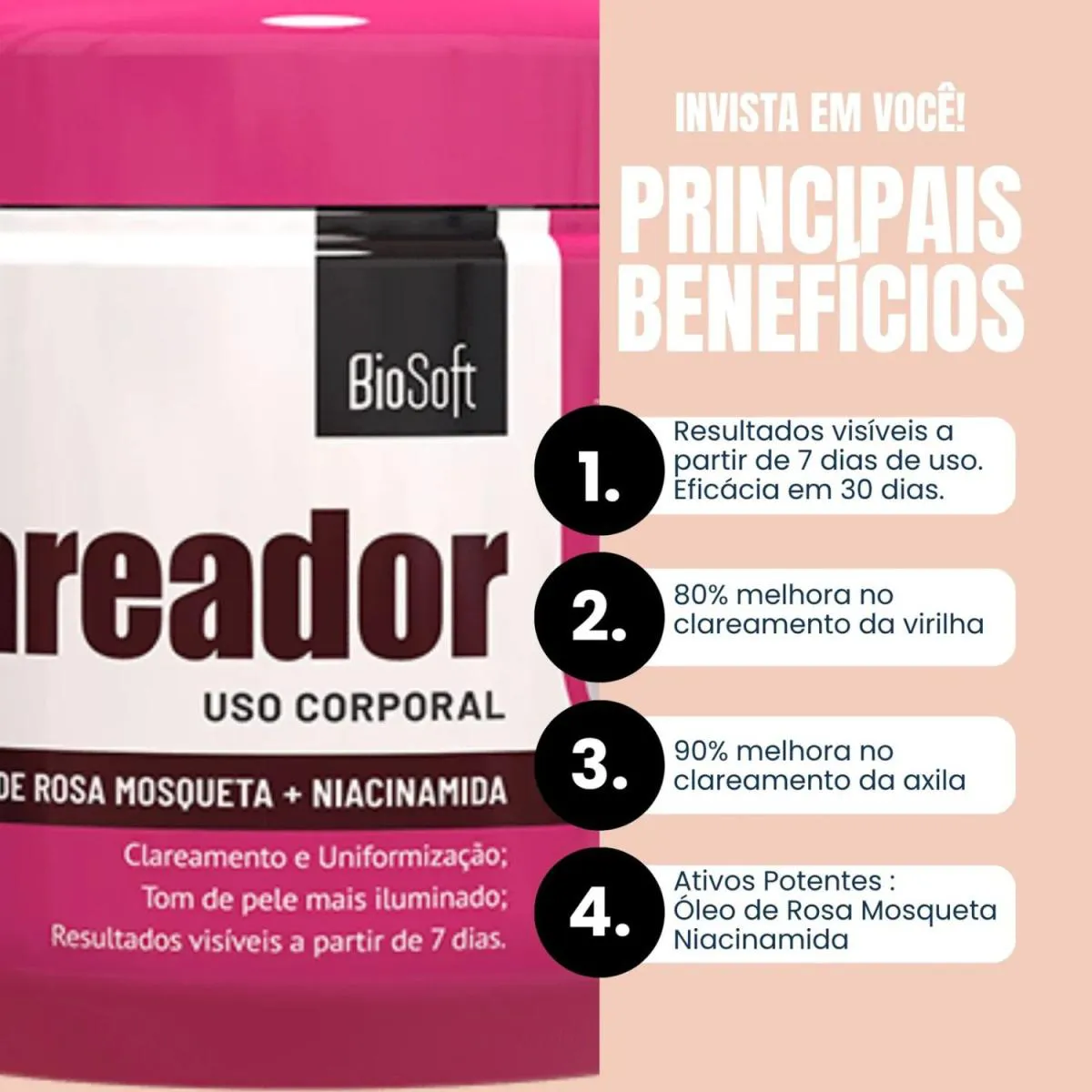 - 80% de melhora no clareamento da virilha.