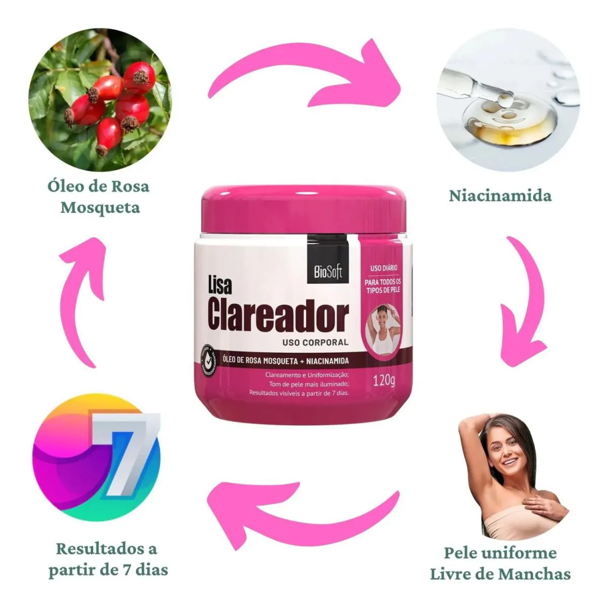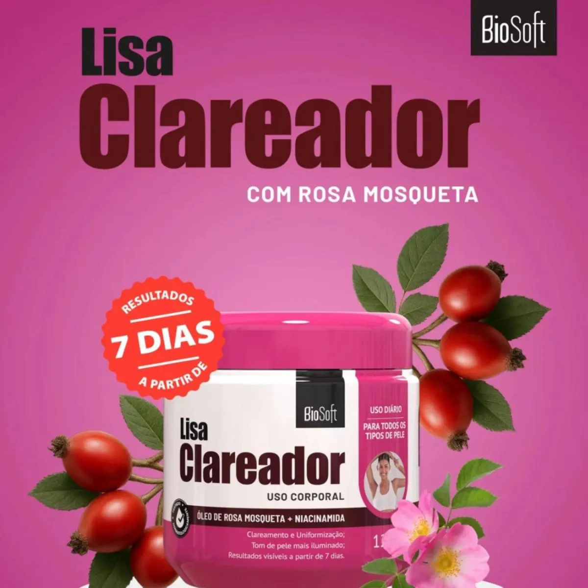 - Fórmula com Rosa Mosqueta e Niacinamida.