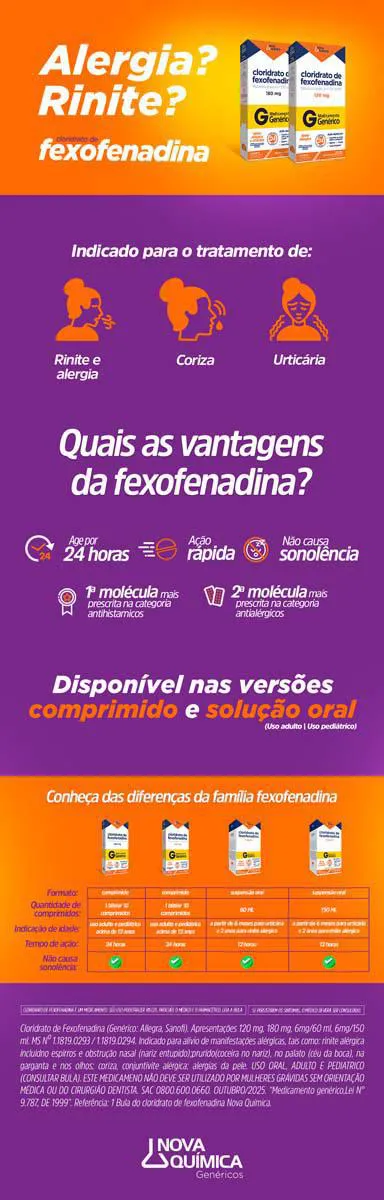 O Cloridrato de Fexofenadina 120mg Nova Química é indicado para o alívio das manifestações alérgicas, tais como: